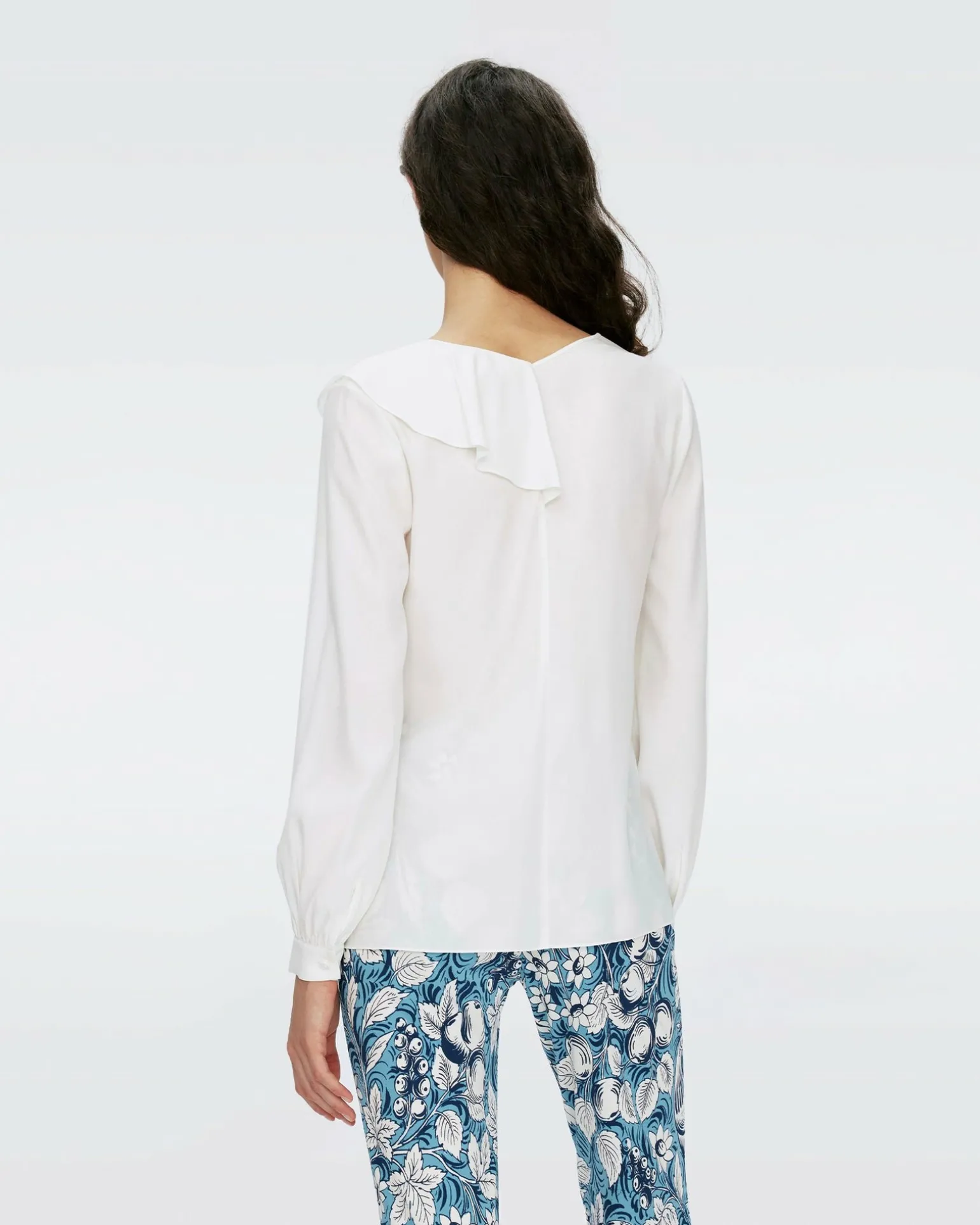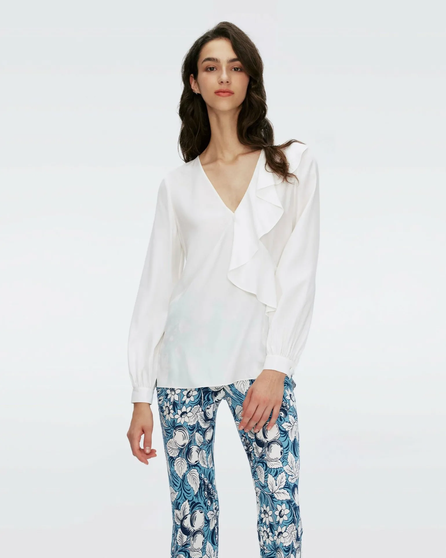 Made From A Sustainably-Sourced Crepe, The Aggie Top Falls In A Soft, Light Drape. This Piece Has Long Sleeves, A V-Neckline, And Ruffle Detail On One Side.