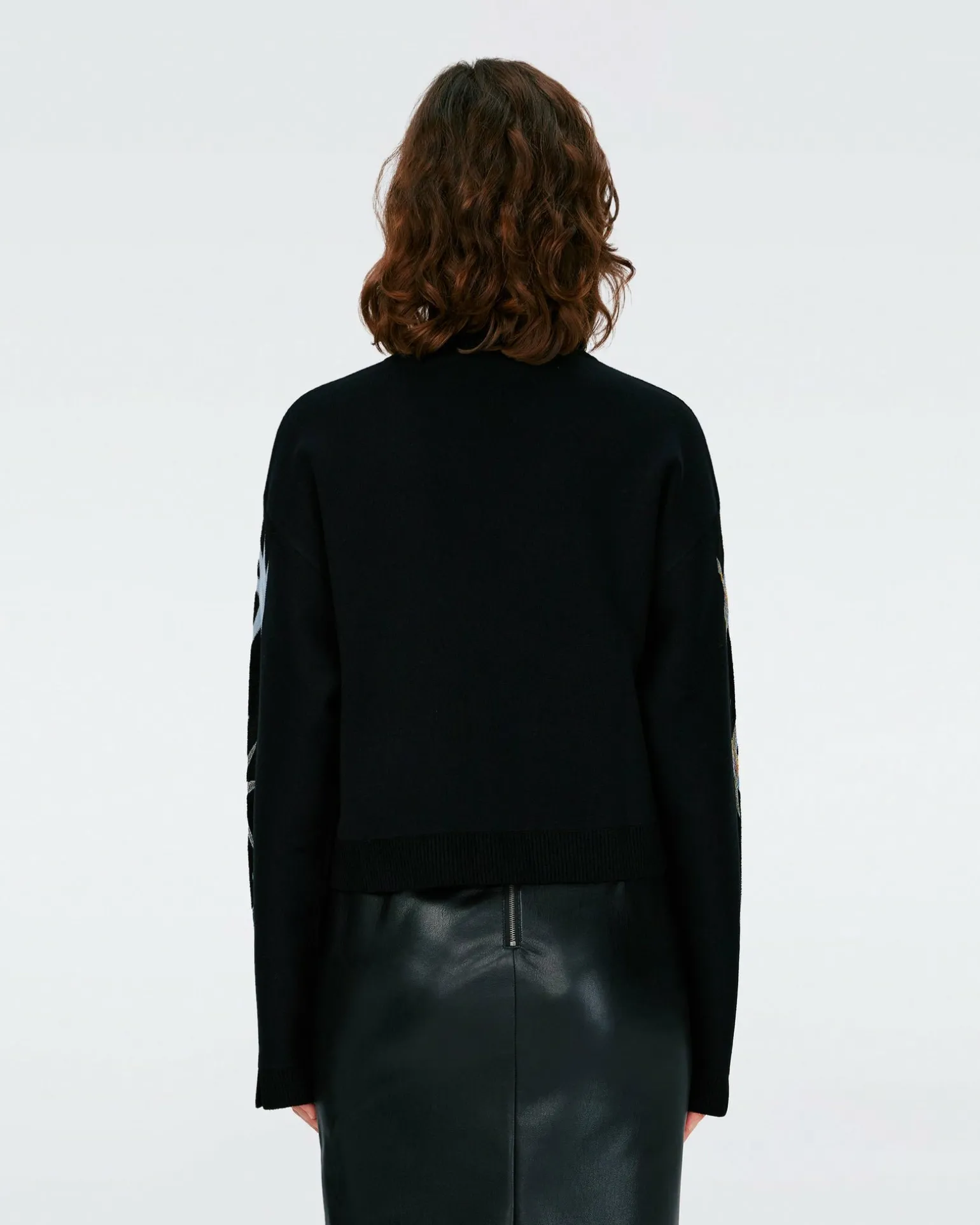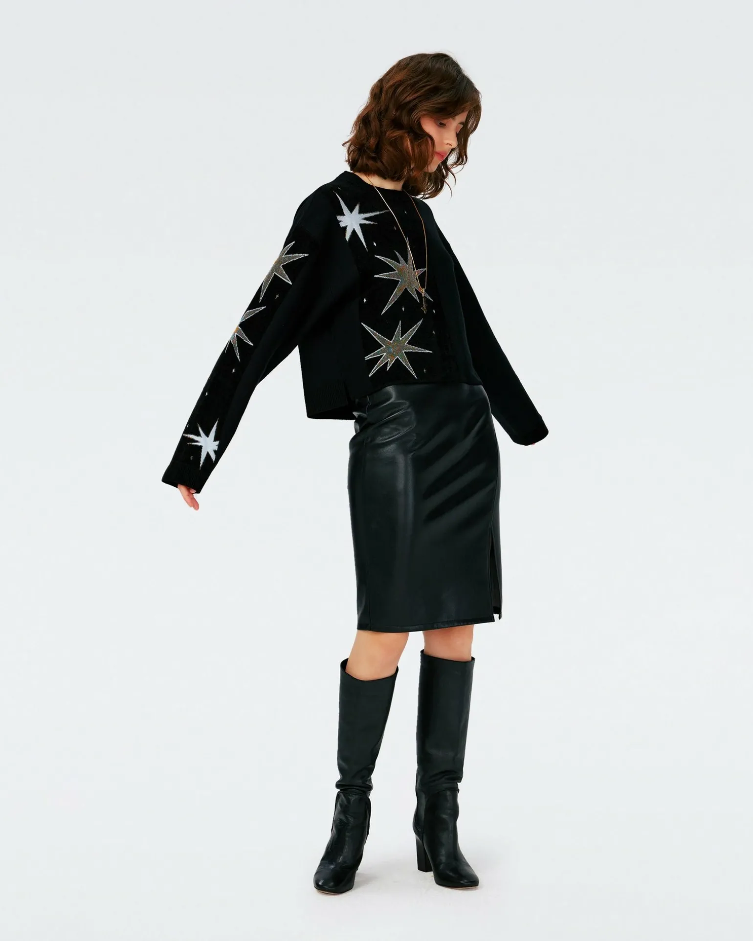Made From A Wool Jacquard, The Fabiola Sweater Has A Warm, Luxurious Feel. This Piece Has Long, Wide Sleeves, A Crew Neck, And A Boxy Silhouette. Accented With A Bold Star Design, It Has A Touch Of Shimmer For Festive Occasions.