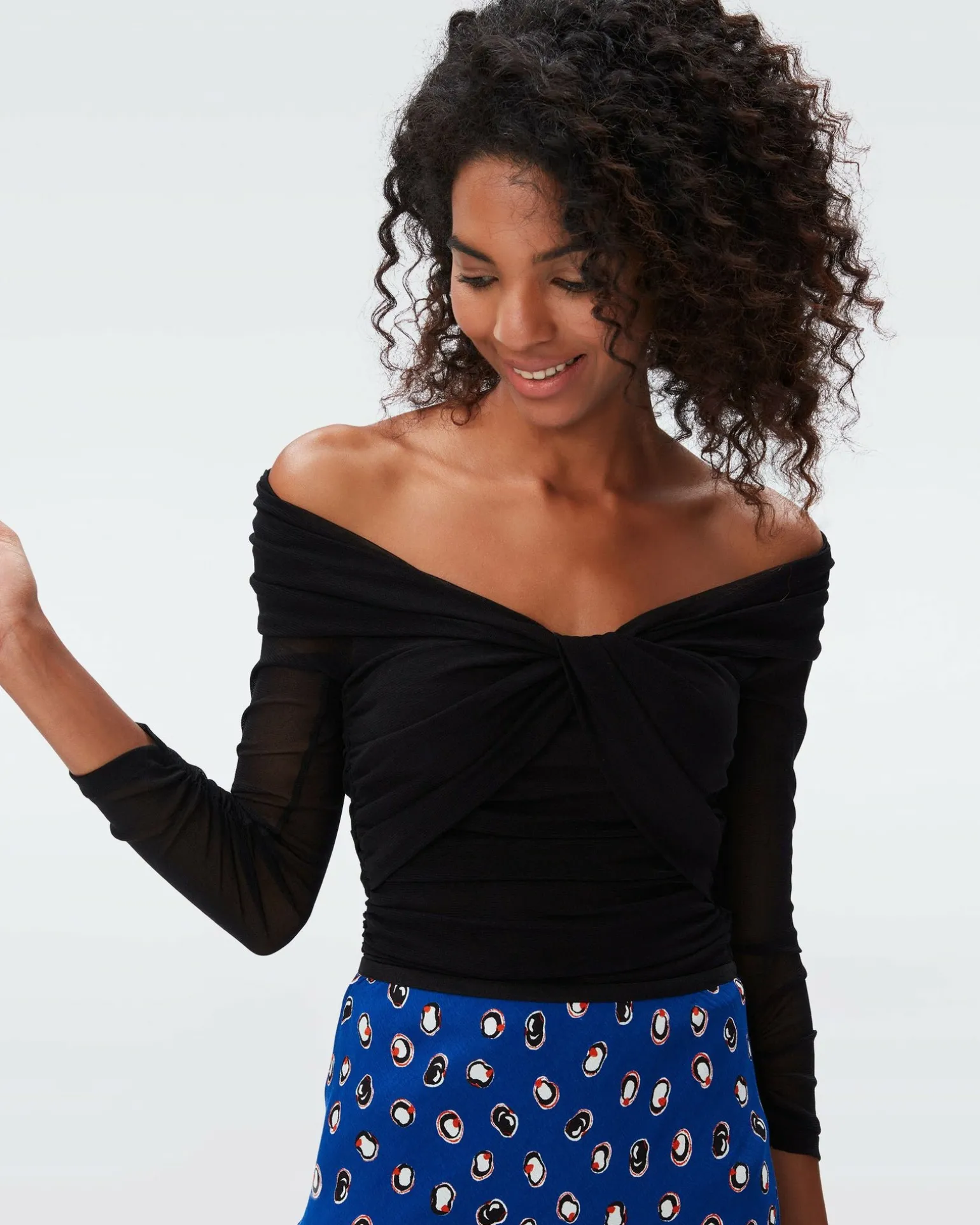 Designed With A Twisted Center, The Dvf Salem Top Can Be Worn On Or Off The Shoulders. Cut From A Body-Hugging Yet Comfortable Mesh, It Has Ruching Along The Bodice And Three-Quarter Sleeves.