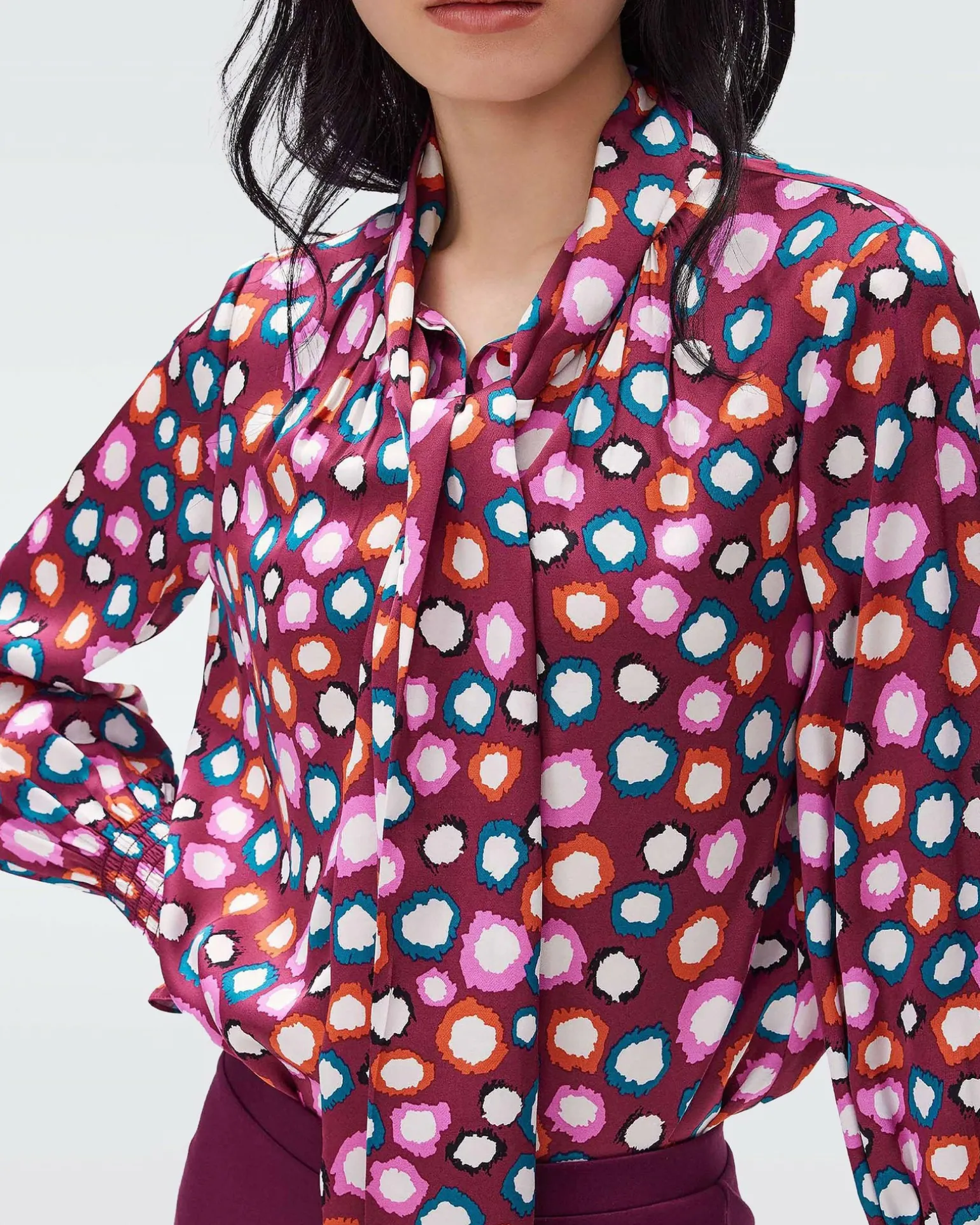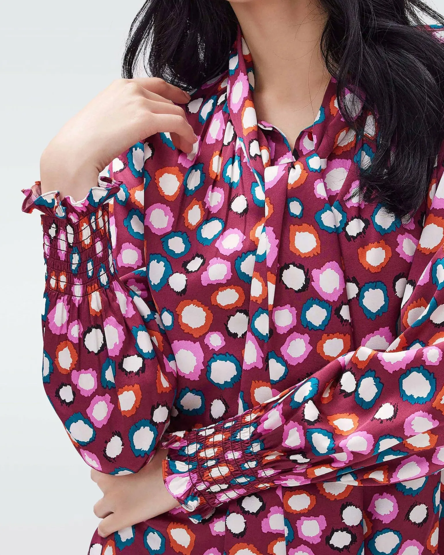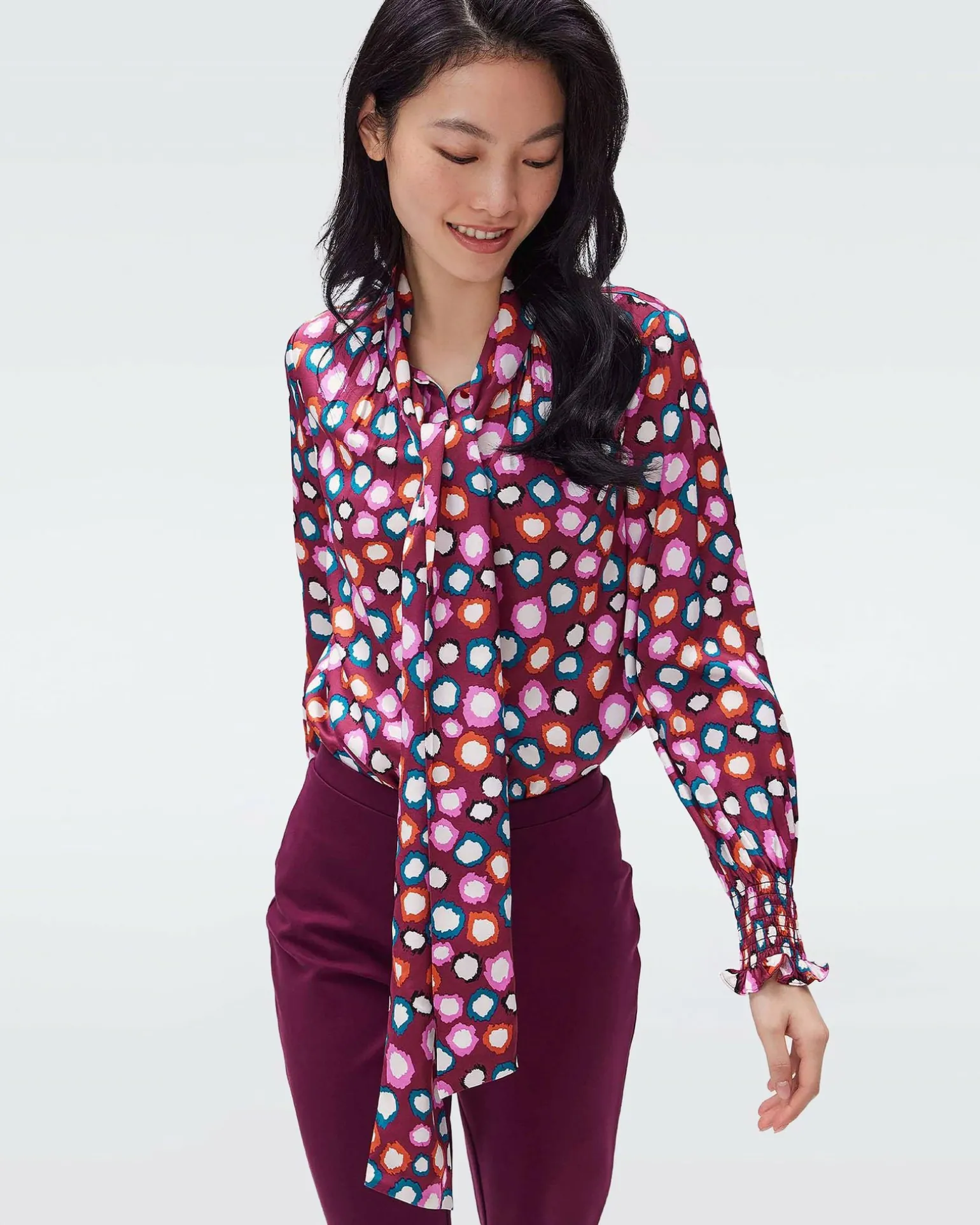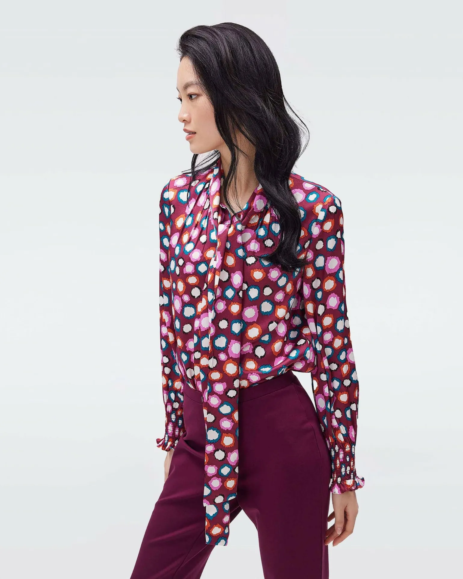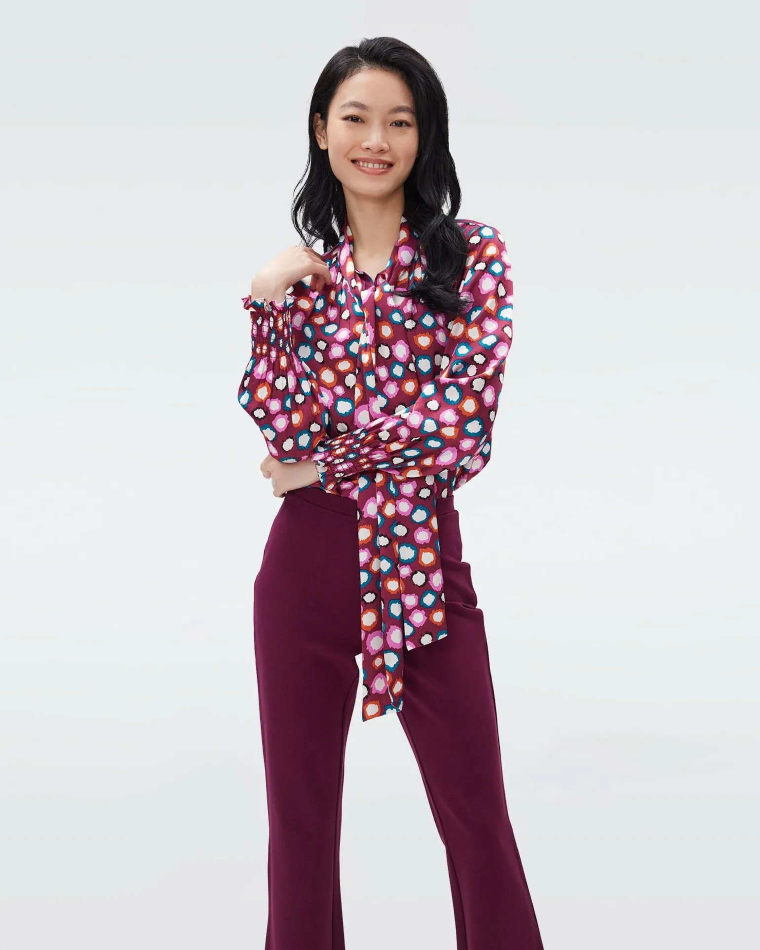 Cut From A Soft Chiffon, The Tina Top Has A Light And Breezy Feel. This Piece Has Long Sleeves, Cinched Wrists With Flared Cuffs, And A Neck Tie That Can Be Left Open Or Closed.