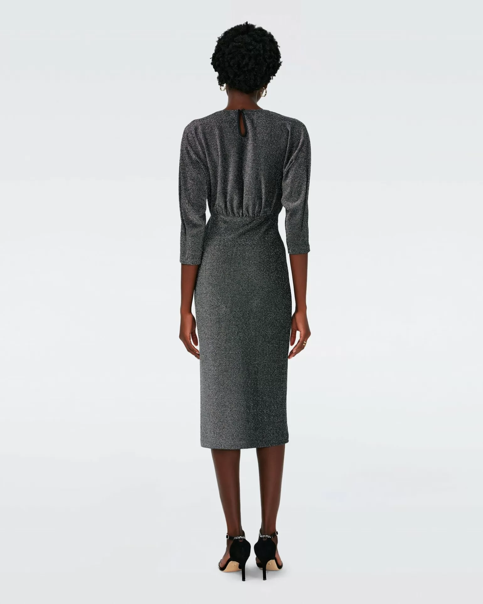 Cut From A Metallic Jersey, The Chrisey Midi Dress Strikes The Balance Between Simple And Sparkly. This Piece Has A Crew Neck, Three-Quarter Sleeves, And Centered Gathering.