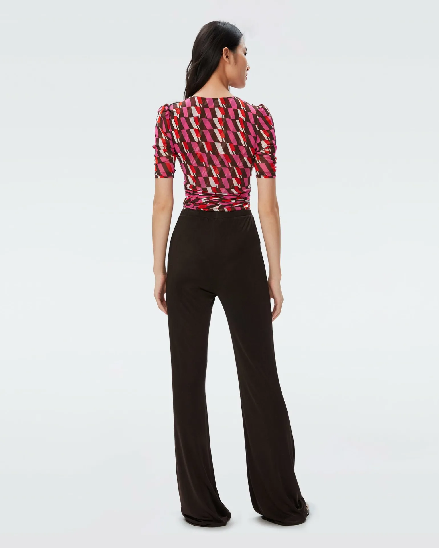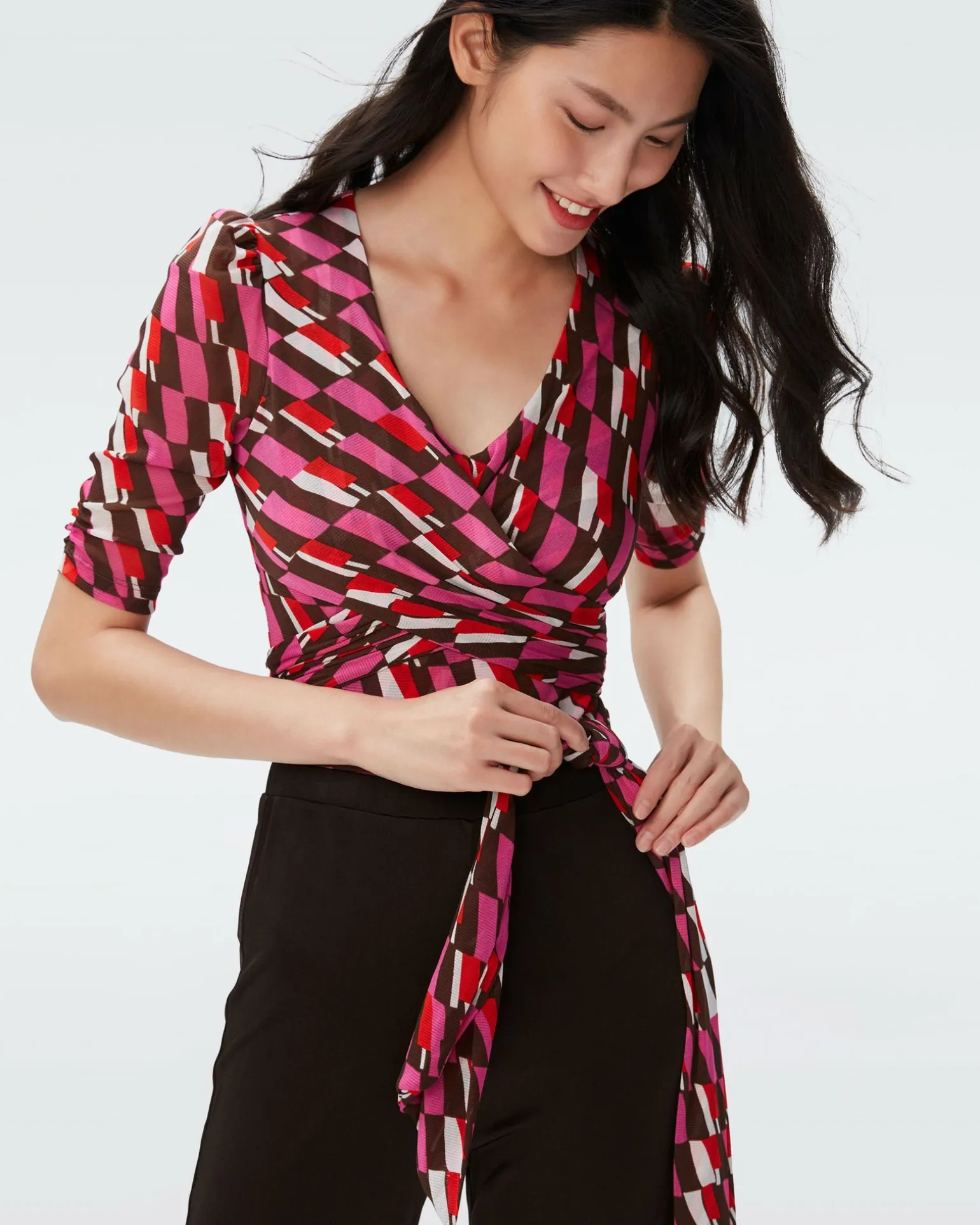Cut From A Soft Mesh, The Dvf Abbie Bodysuit Has Comfortable Stretch, Making It Perfect For All-Day Wear. This Piece Has Short Subtly Ruched Sleeves, A V-Neckline, Flattering Gathering, And Ties Around The Waist.