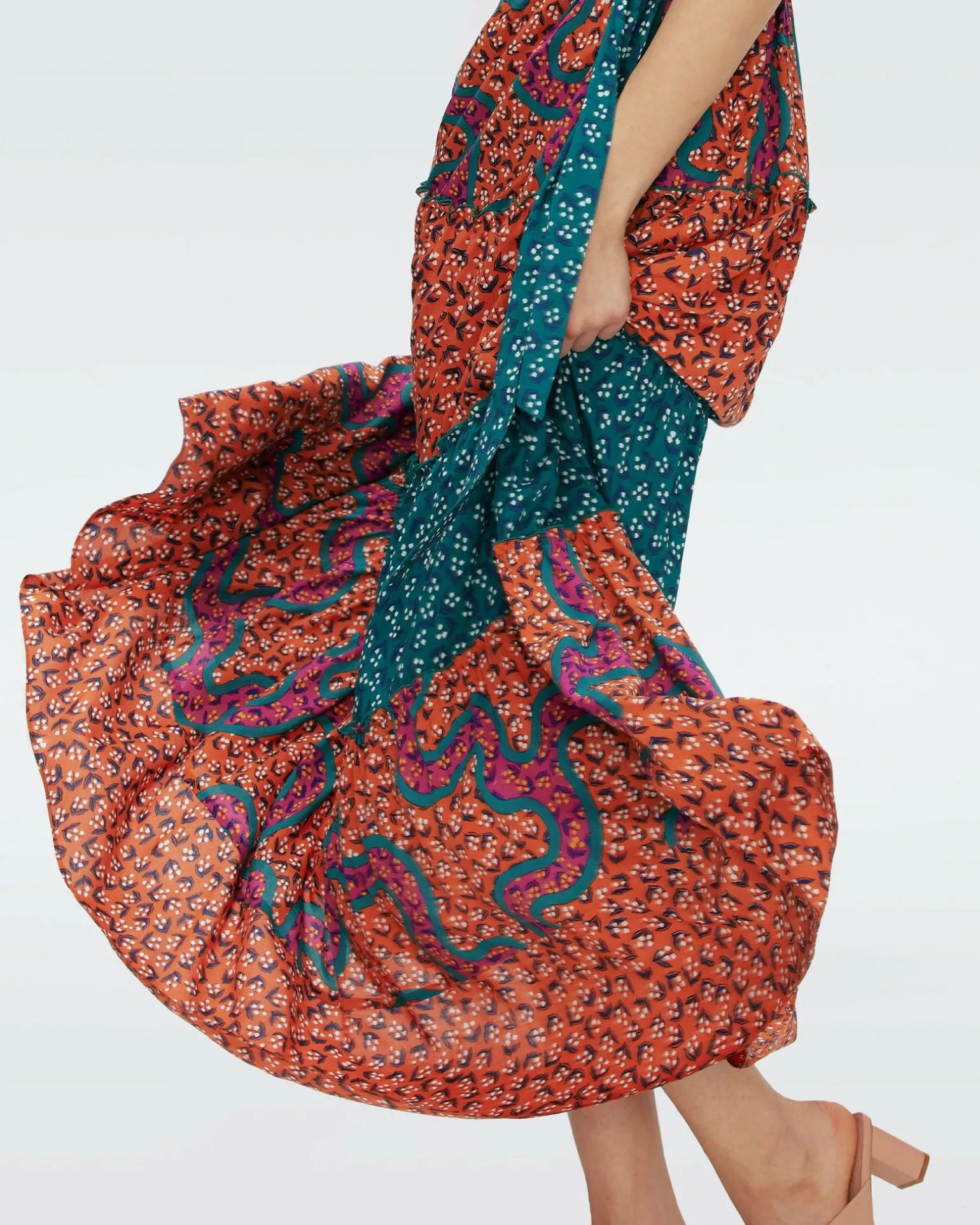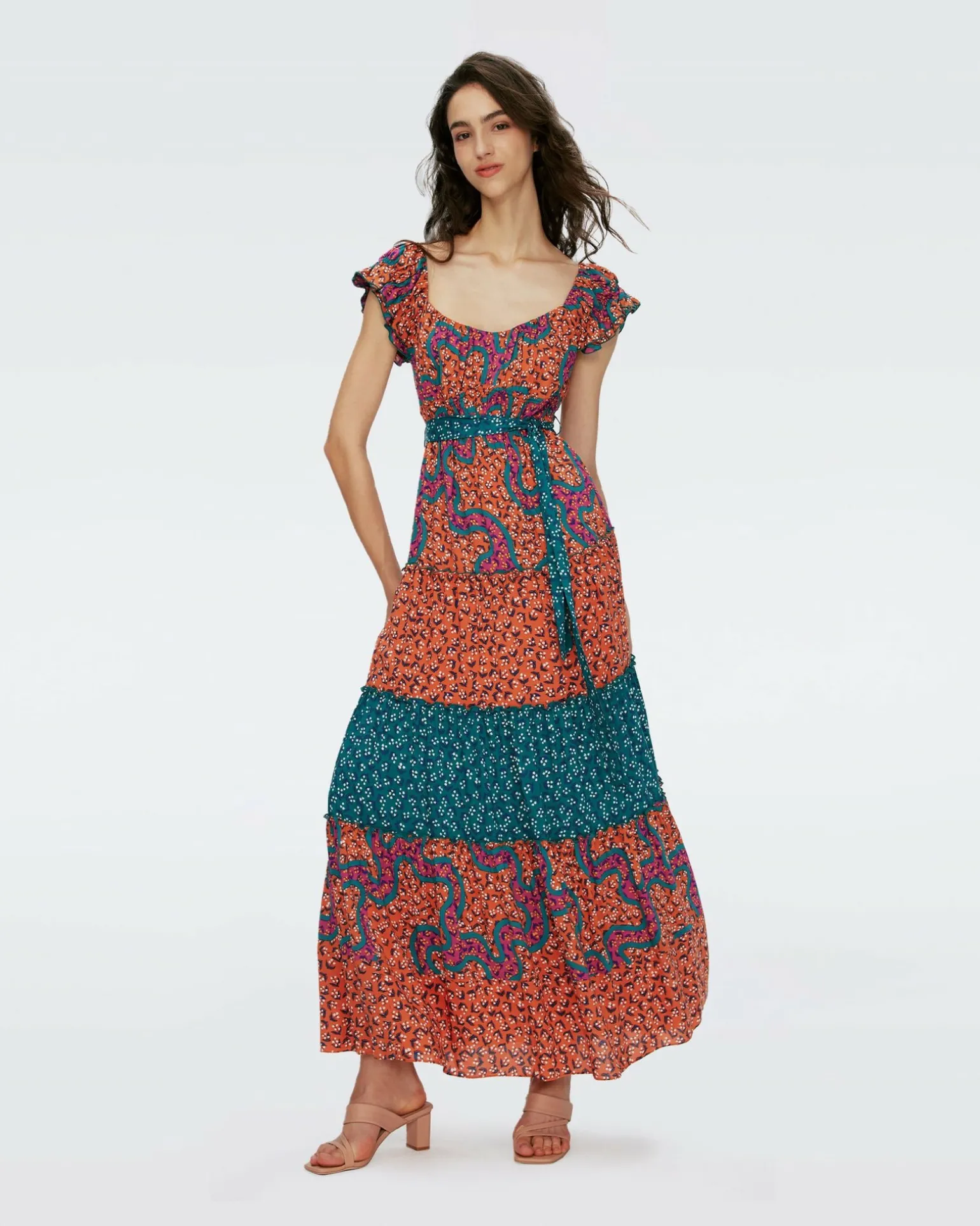 Cut From A Linen-Like Blend, The Alejandro Maxi Dress Has A Light And Effortless Feel. This Piece Has Short, Ruffled Sleeves, A Scoop Neckline, And A Contrasting Tie That Cinches The Waist. Its Full, Tiered Skirt Combines Contrasting Prints, And Has A Fun, Twirl-Worthy Feel.