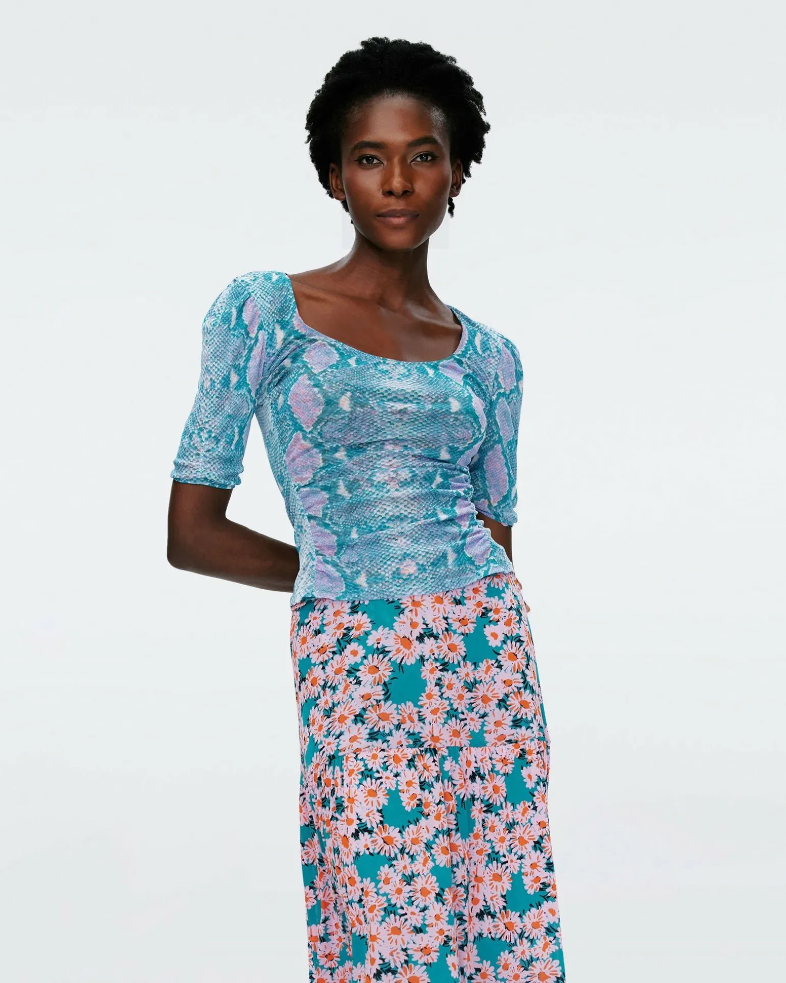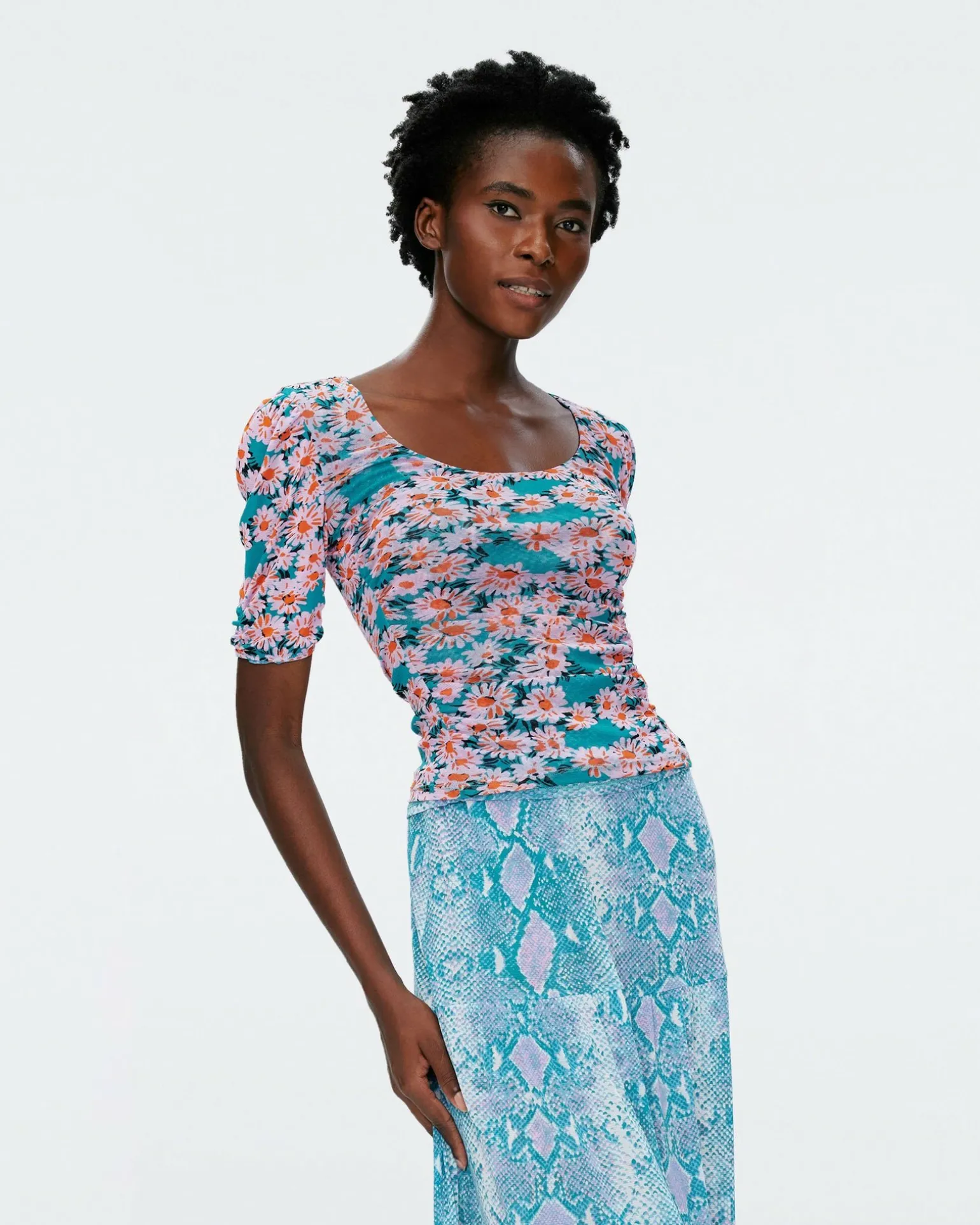 Two Pieces In One, The Reversible Ali Top Features An Animal Print On One Side And A Floral Print On The Other. Cut From A Stretchy Mesh, It Has A Close Yet Comfortable Fit With Short Ruched Sleeves And A Scoop Neckline.