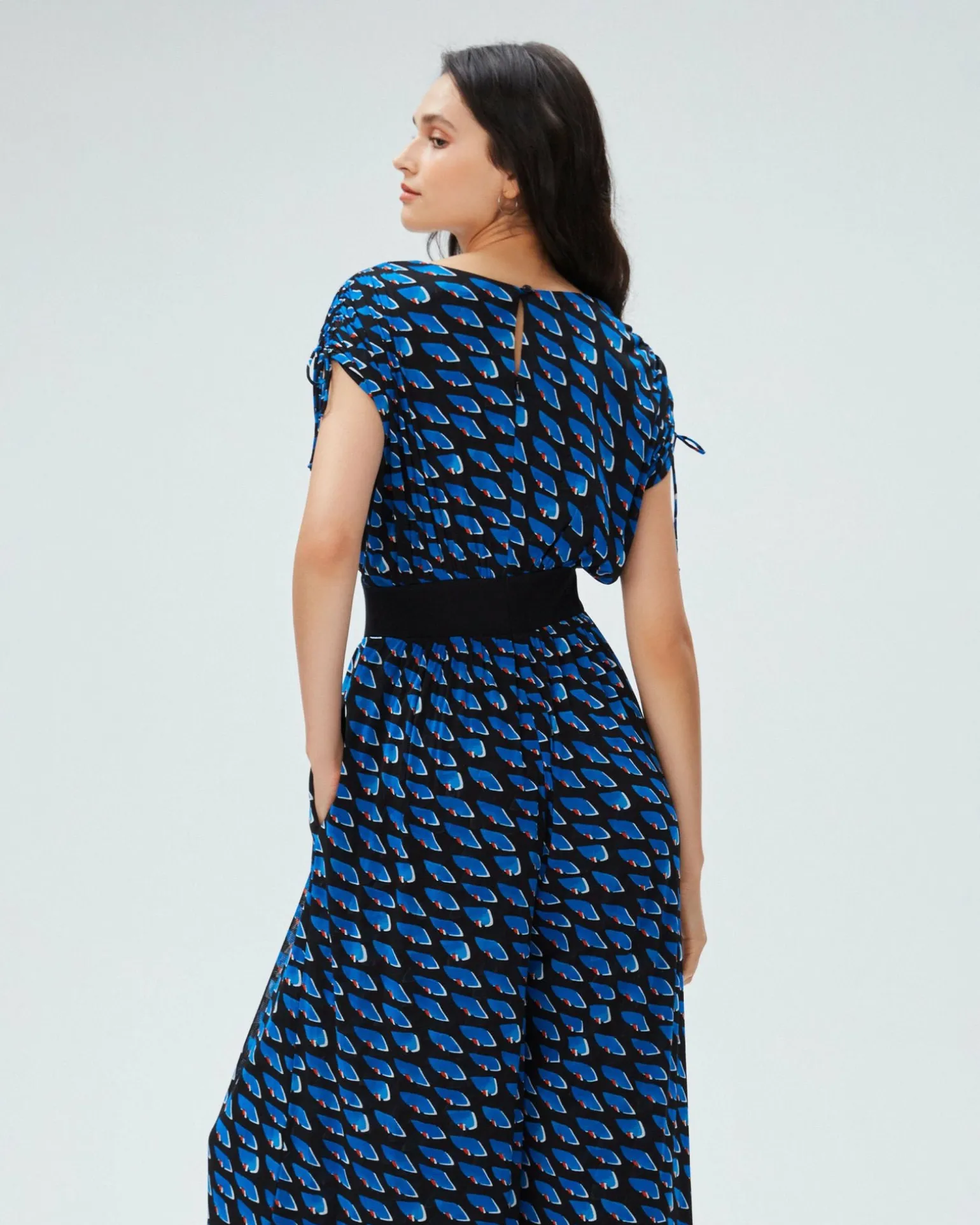 Flowy Yet Fitted, The Dvf Andra Jumpsuit Is Cut From A Stretchy And Comfortable Mesh. This Piece Has A High Scoop Neckline, Short Capped Sleeves With Drawstring Detail, And A Flattering, Contrasting Waistband. Loose-Fitting Legs Give This Jumpsuit A Comfortable, Breezy Fit.