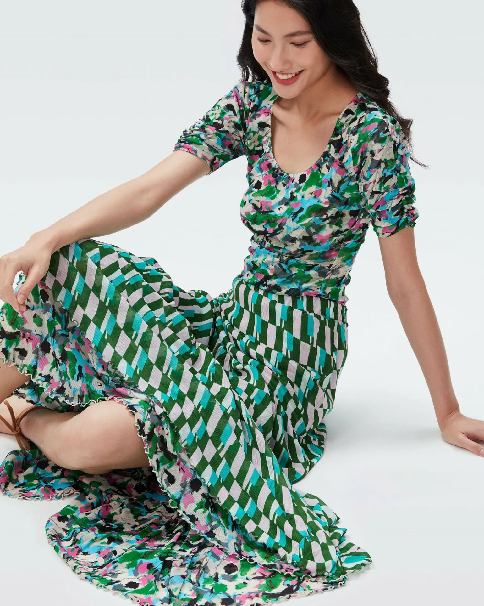 The Dvf Austria Skirt Is Made From A Comfortable, Stretchy Mesh. Figure-Hugging Around The Waist, It Fans Out Into A Tiered, Flowy Skirt With A Lettuce Hem That Brushes The Ankle. A Reversible Piece, It Has A Geometric Print On One Side, And A Floral Print On The Other.