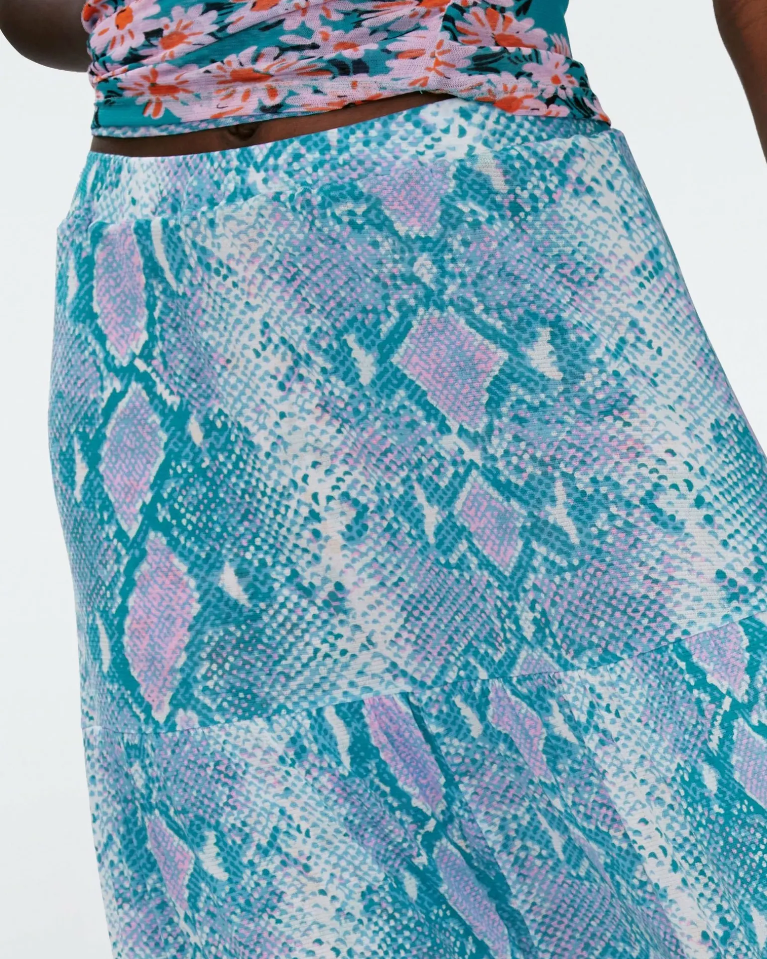 The Austria Skirt Is Made From A Comfortable, Stretchy Mesh. Figure-Hugging Around The Waist, This Skirt Fans Out Into A Tiered, Flowy Shape With A Lettuce Hem That Brushes The Ankle. A Reversible Piece, The Austria Features An Animal Print On One Side And A Floral Print On The Other.