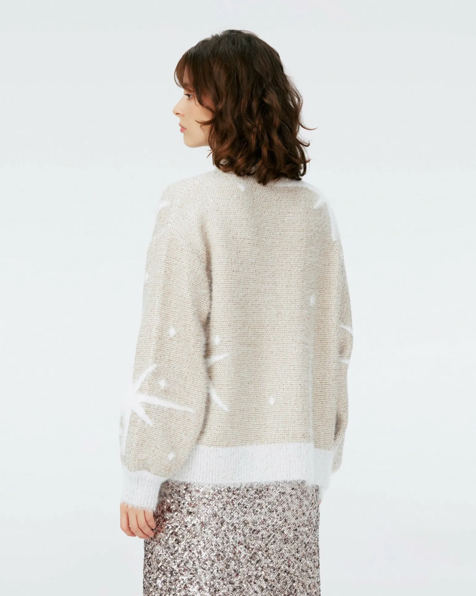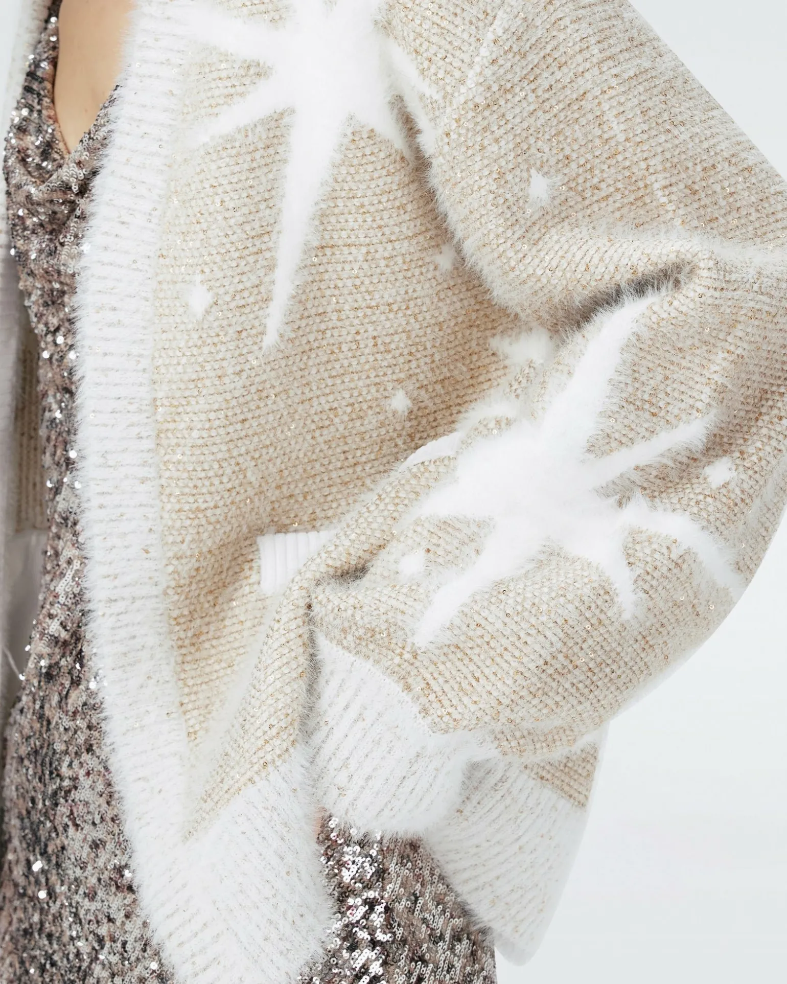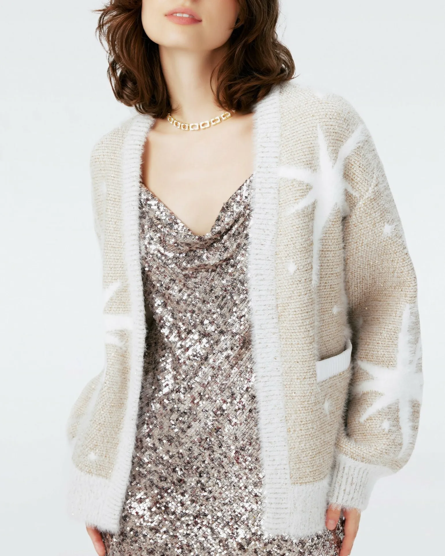 Made From A Knit Jacquard, The Avalon Cardigan Features A Large-Scale Star Design. This Plush Piece Has Contrasting Trim And Billowy Sleeves. Wear It To Add Warmth To Your Party Look Or Layer It With Your Everyday Essentials To Update Your Look For The Season.
