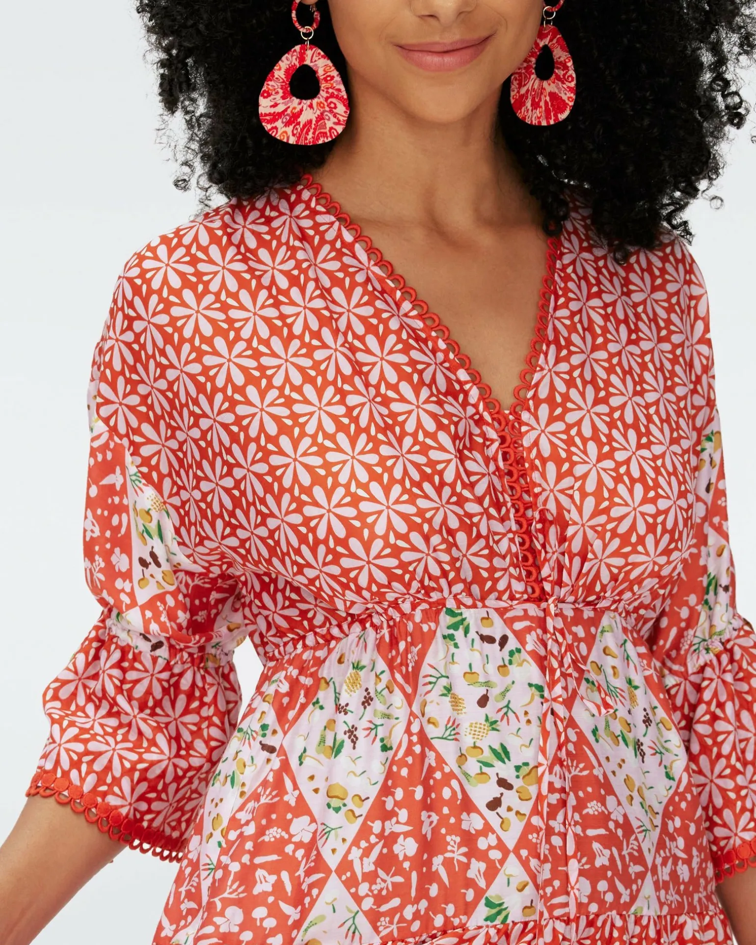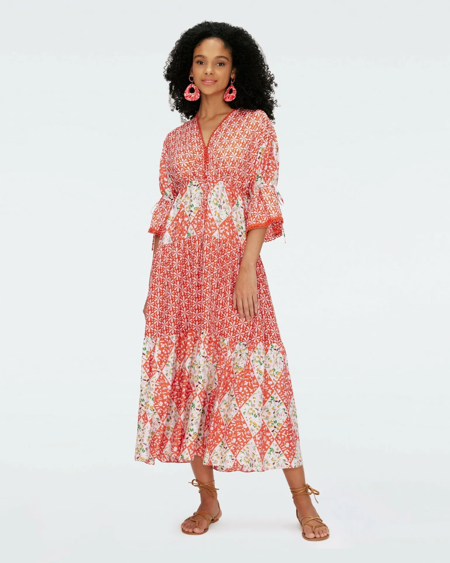 Flowy And Relaxed, The Sleeves And Skirt On The Boris Midi Dress Are Tiered And Loose-Fitting. Its Waist Is Cinched By A Drawstring That Allows For A Custom Fit And Its V-Neckline And Sleeves Are Outlined With Loop Details. Cut From A Silk Blend, It Has A Smooth Feel And A Light Drape.