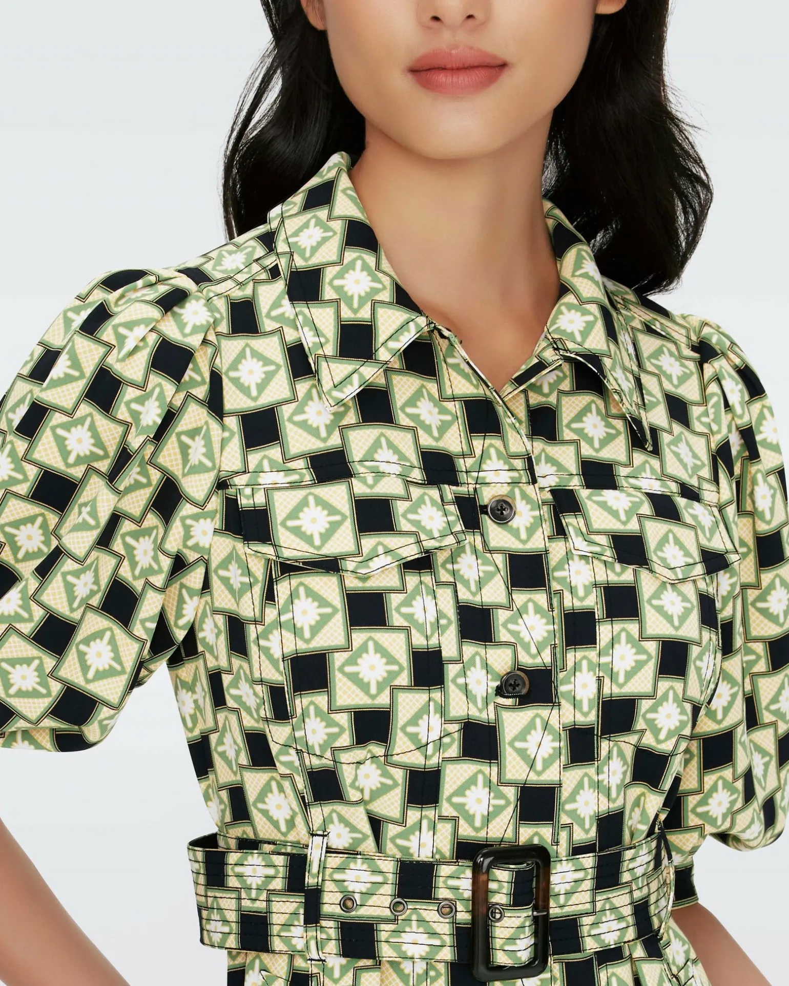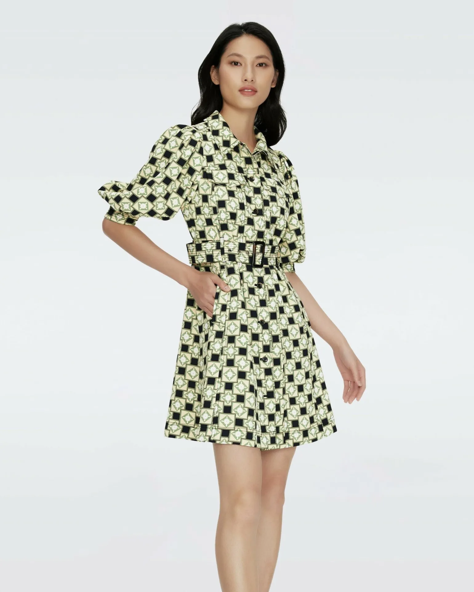 The Britney Dress Is Cut From A Smooth And Stretchy Poly-Spandex Blend. This Piece Has Puffed Half-Sleeves That Cinch Above The Elbow And A Matching Belt That Shows Off The Waist. A Shirt Dress Design, It Features A Classic Collar And Fabric-Button Closure Down The Center. Did We Mention It Has Pockets?
