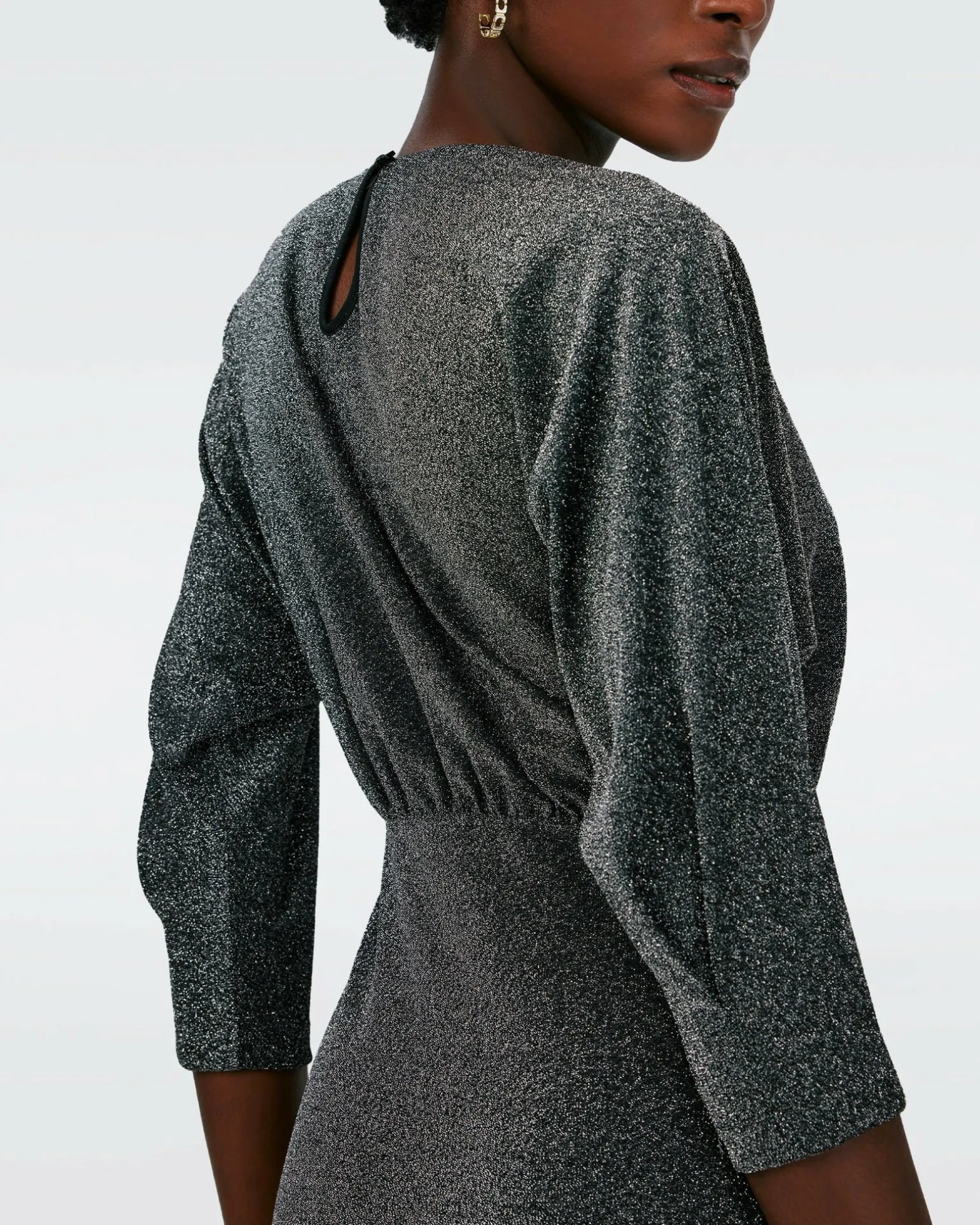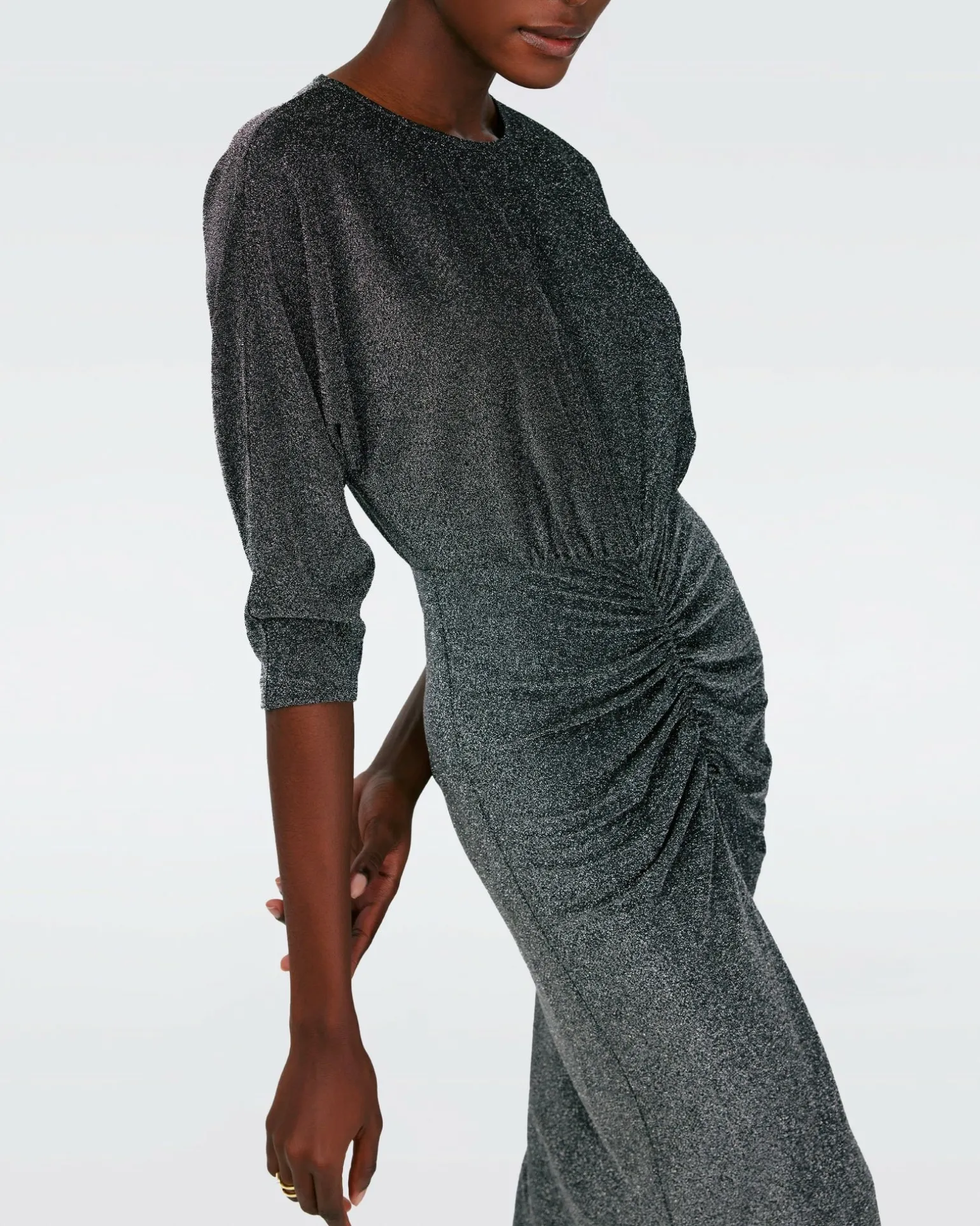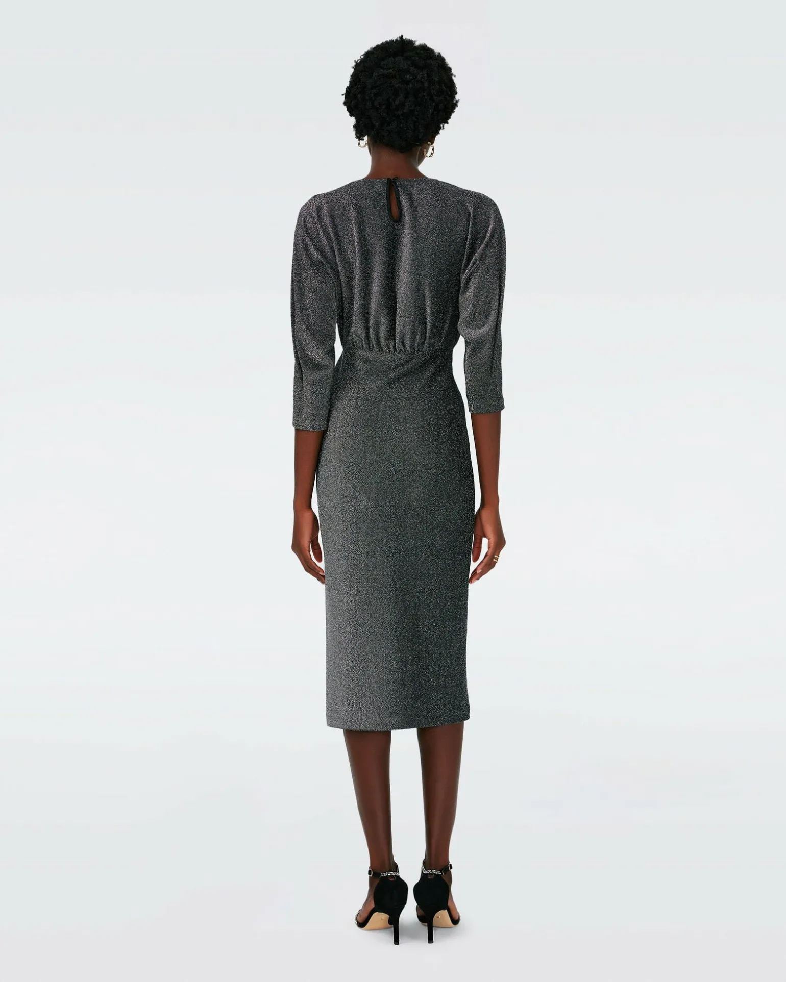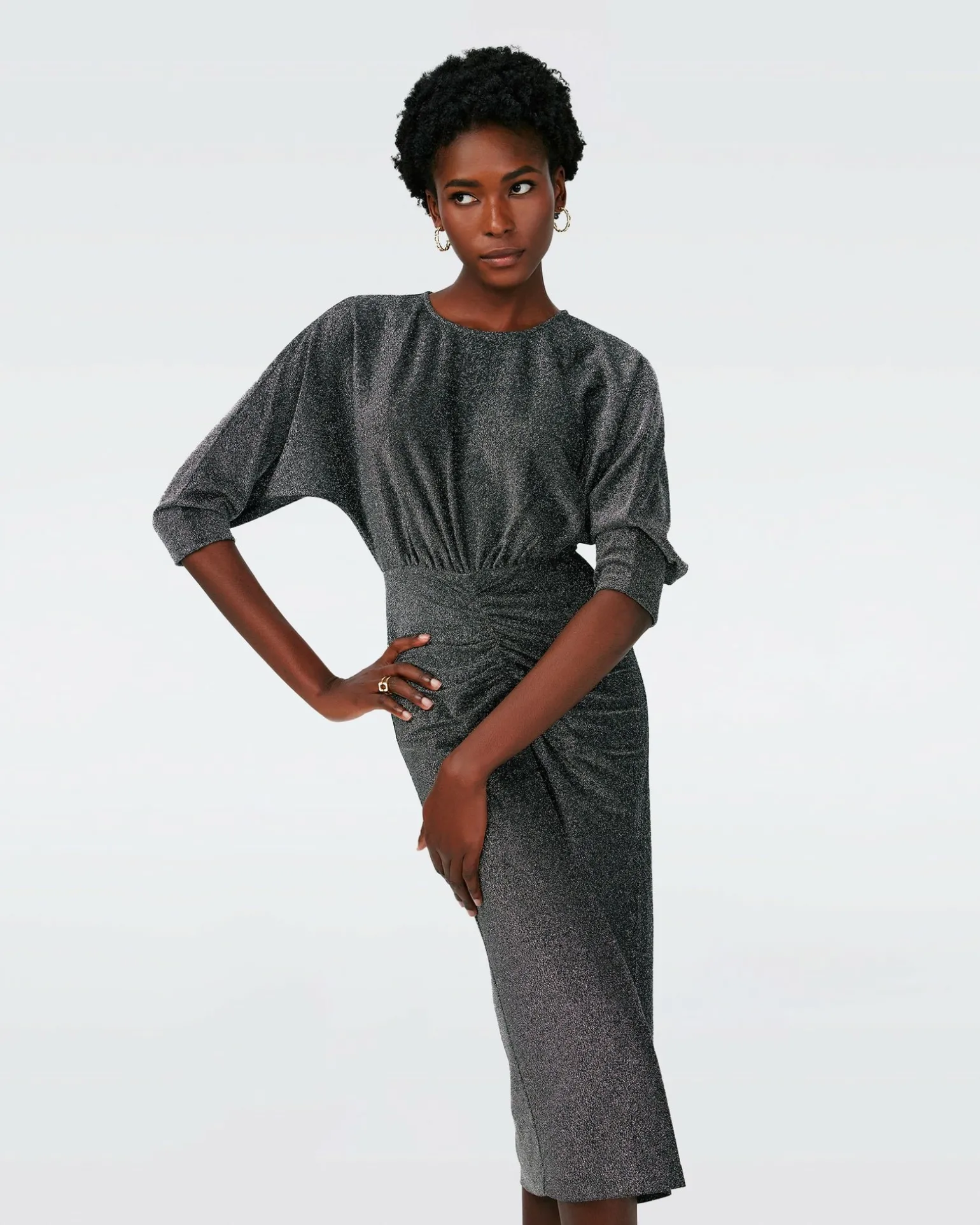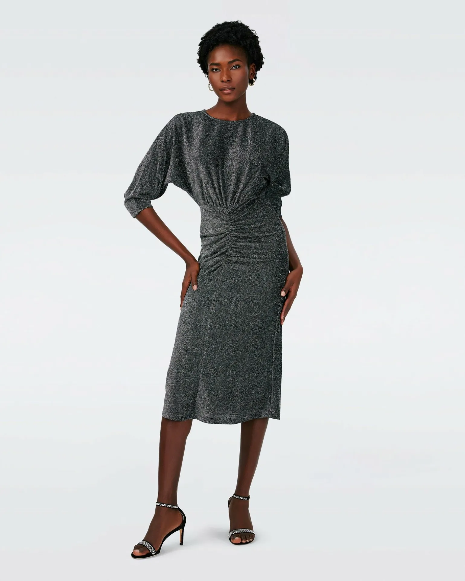Cut From A Metallic Jersey, The Chrisey Midi Dress Strikes The Balance Between Simple And Sparkly. This Piece Has A Crew Neck, Three-Quarter Sleeves, And Centered Gathering.