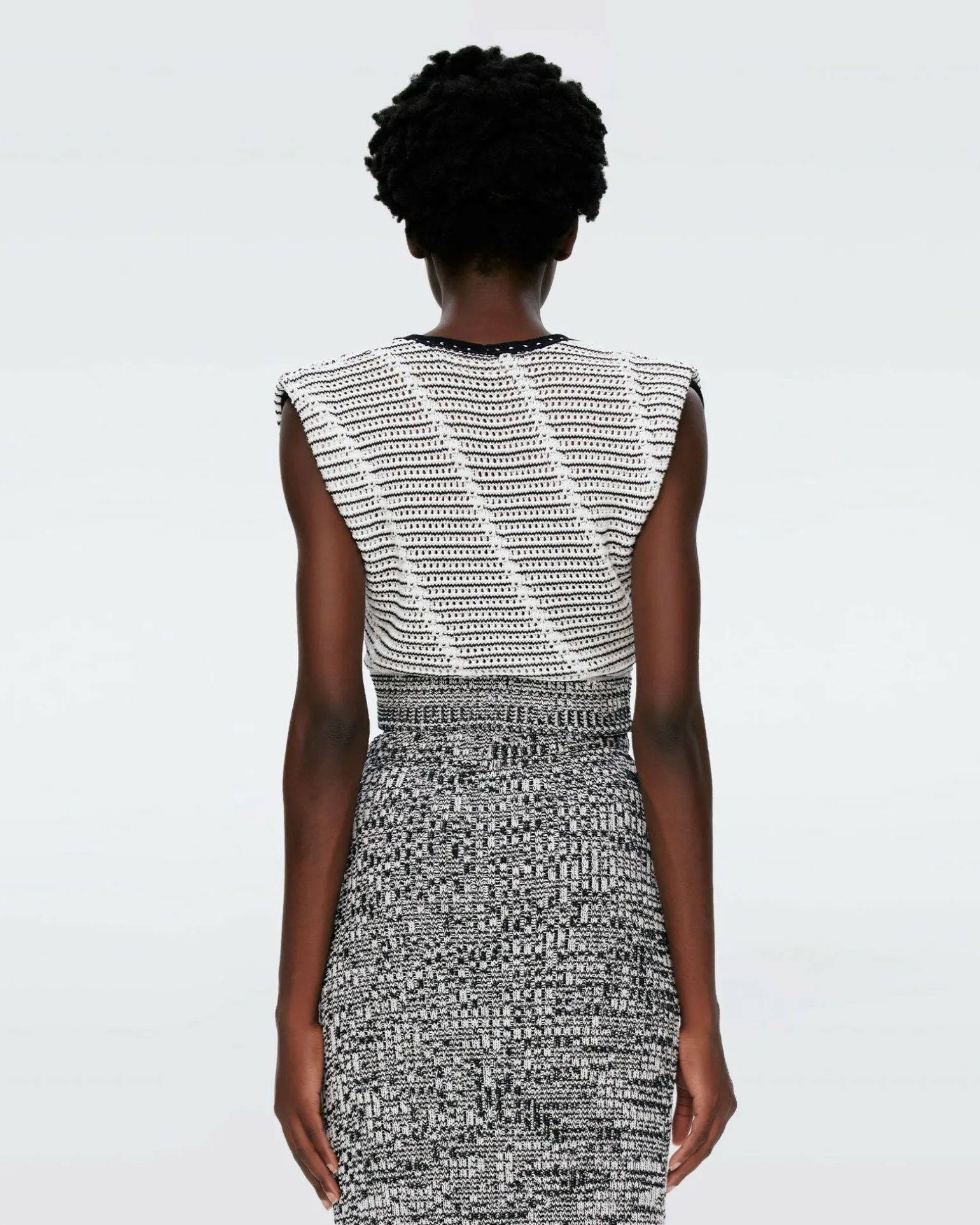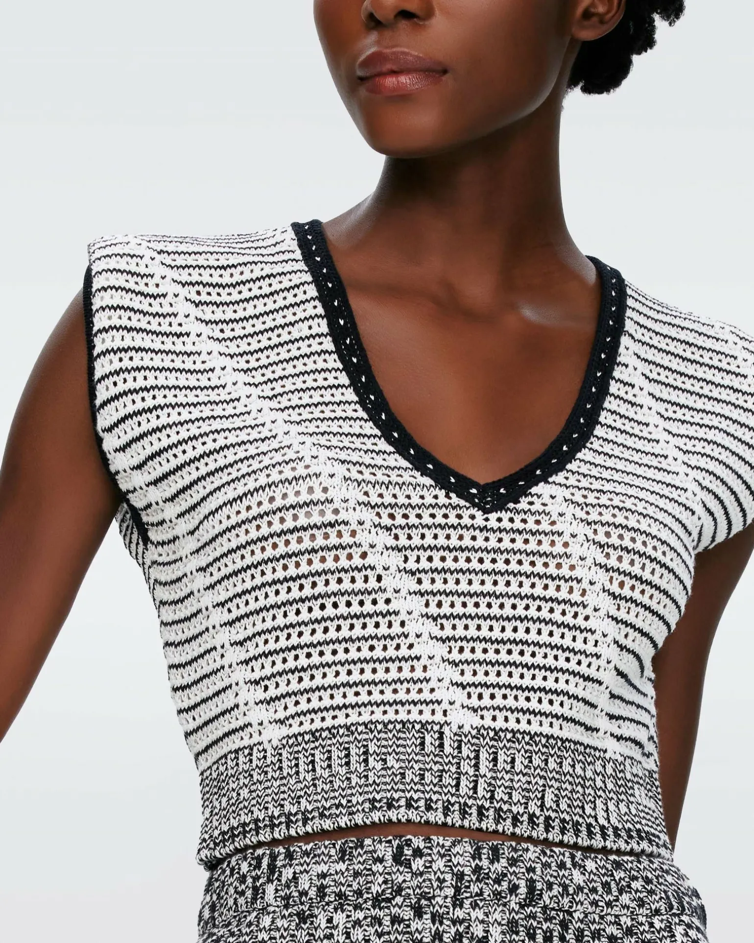 A Cotton Crochet Piece, The Claud Top Is Soft And Textured. This Sleeveless Piece Has A V-Neckline Featuring Solid Trim And A Cropped, Close Fit.