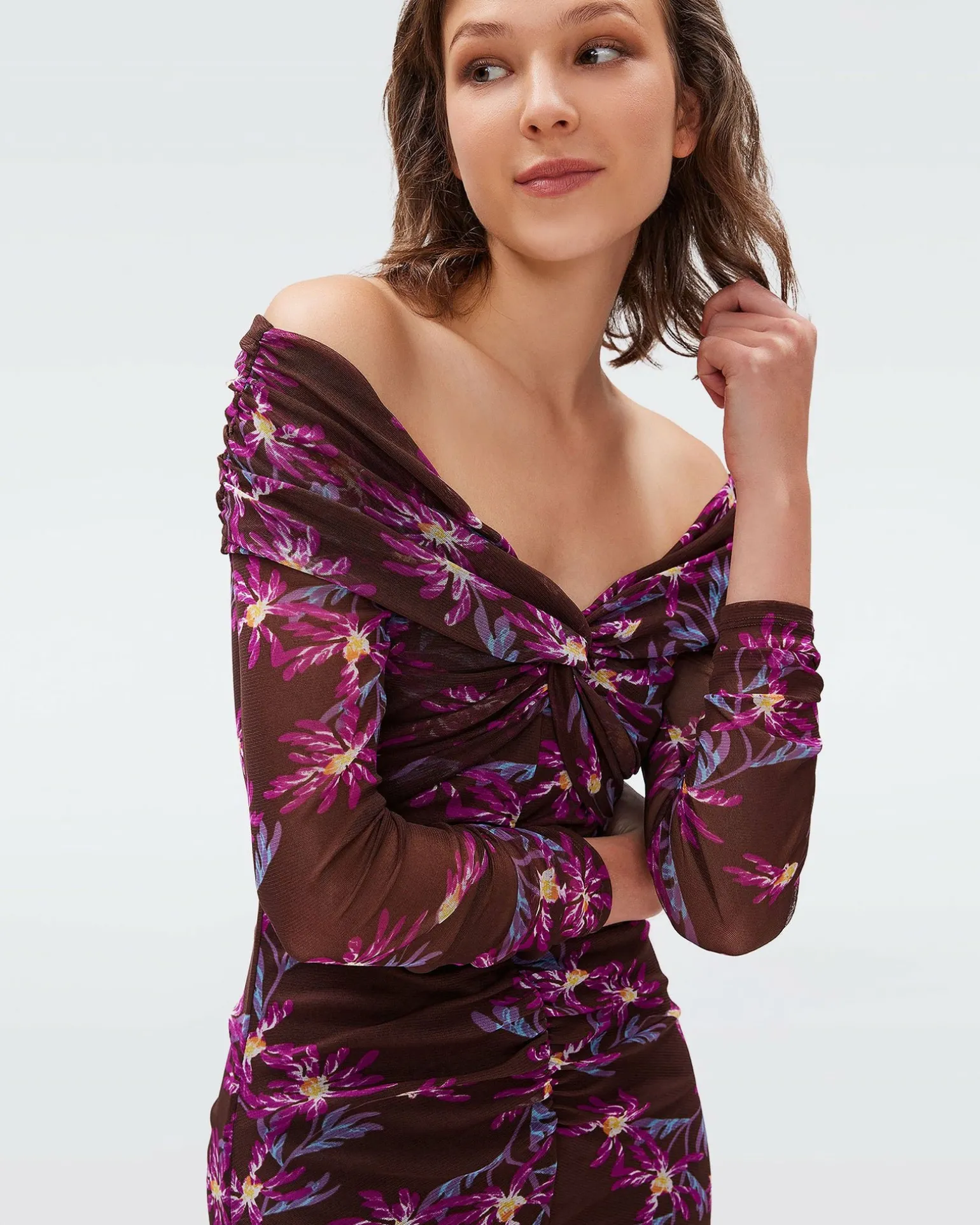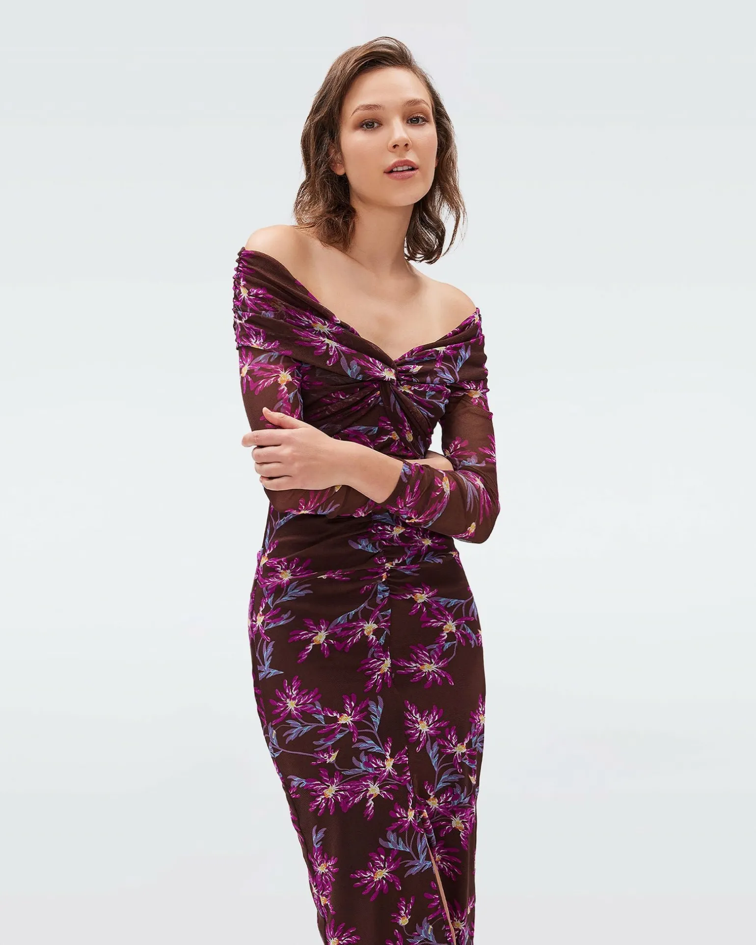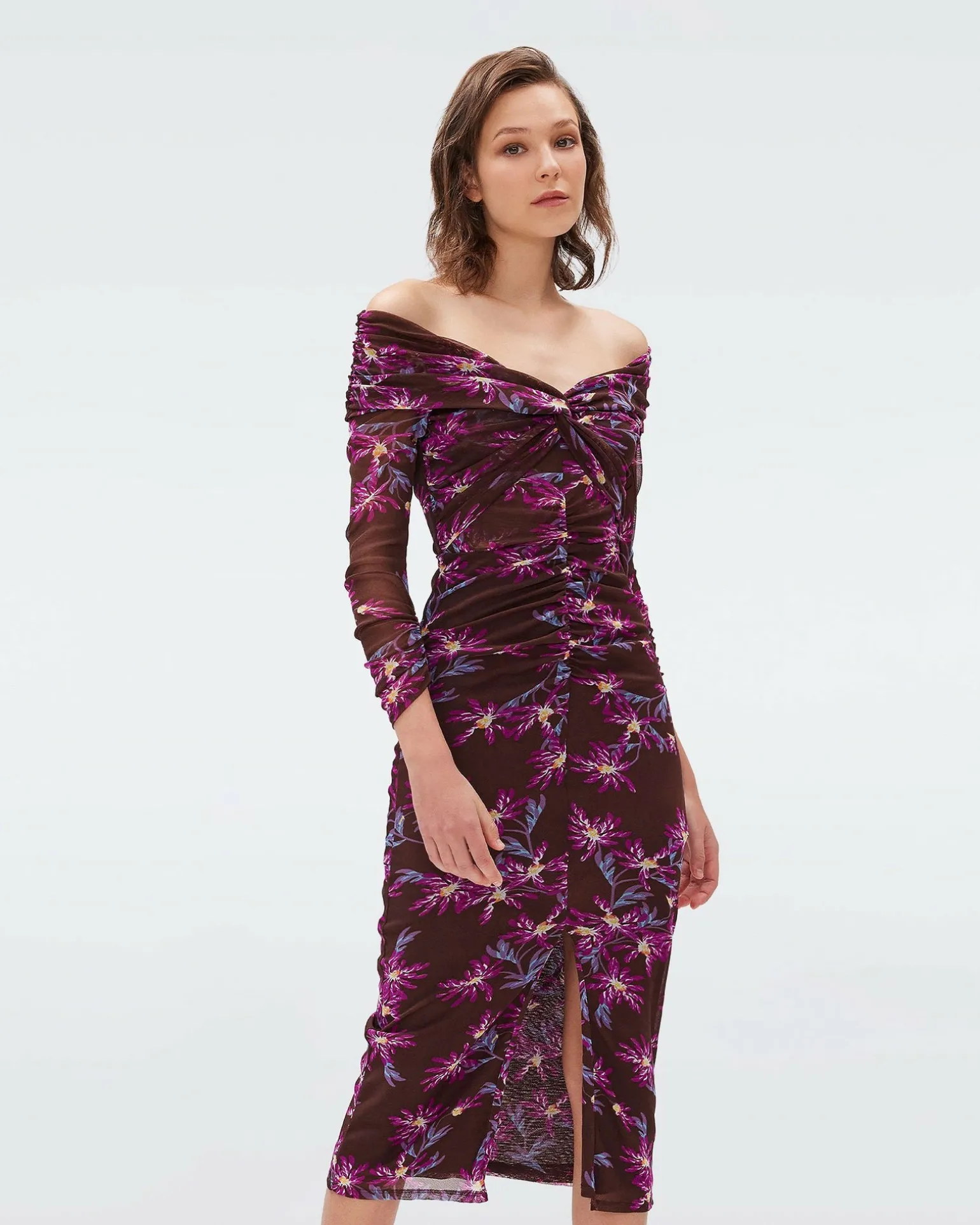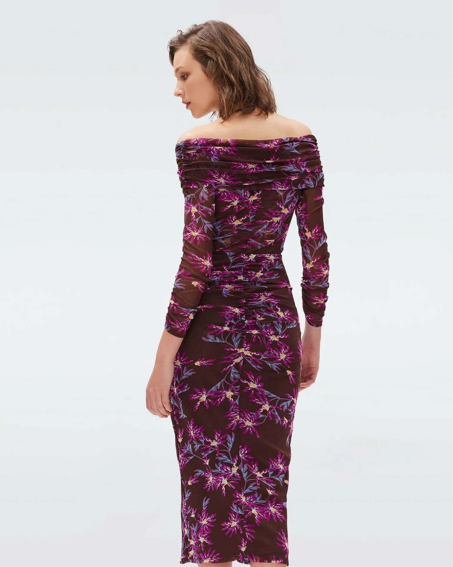 Sexy And Feminine, The Clementine Dress Is Cut From A Soft, Stretchy Mesh. This Piece Has Subtly Sheer Bracelet-Length Sleeves And Sits Off The Shoulders. Fitted And Ruched, Its Skirt Features A Centered Slit.