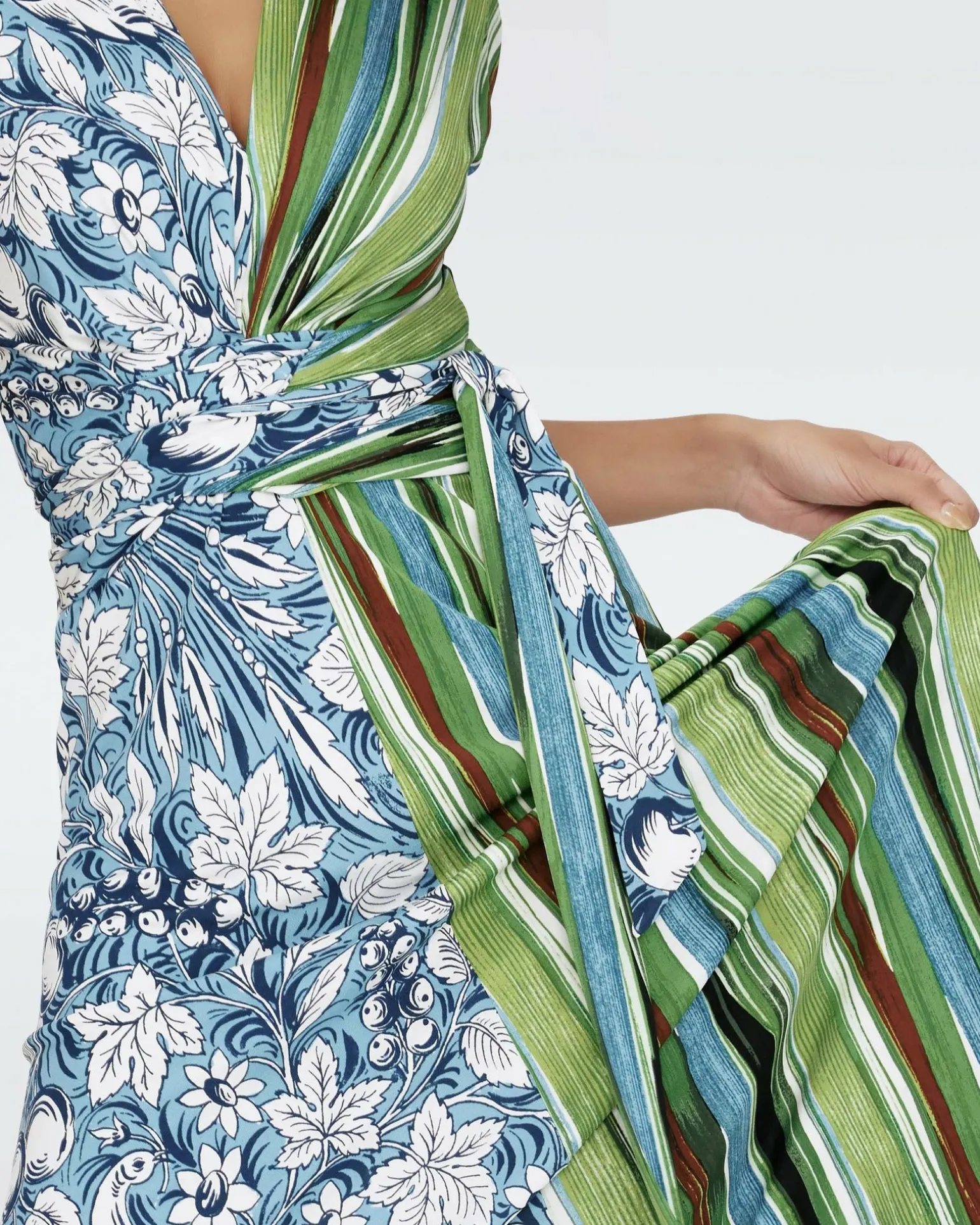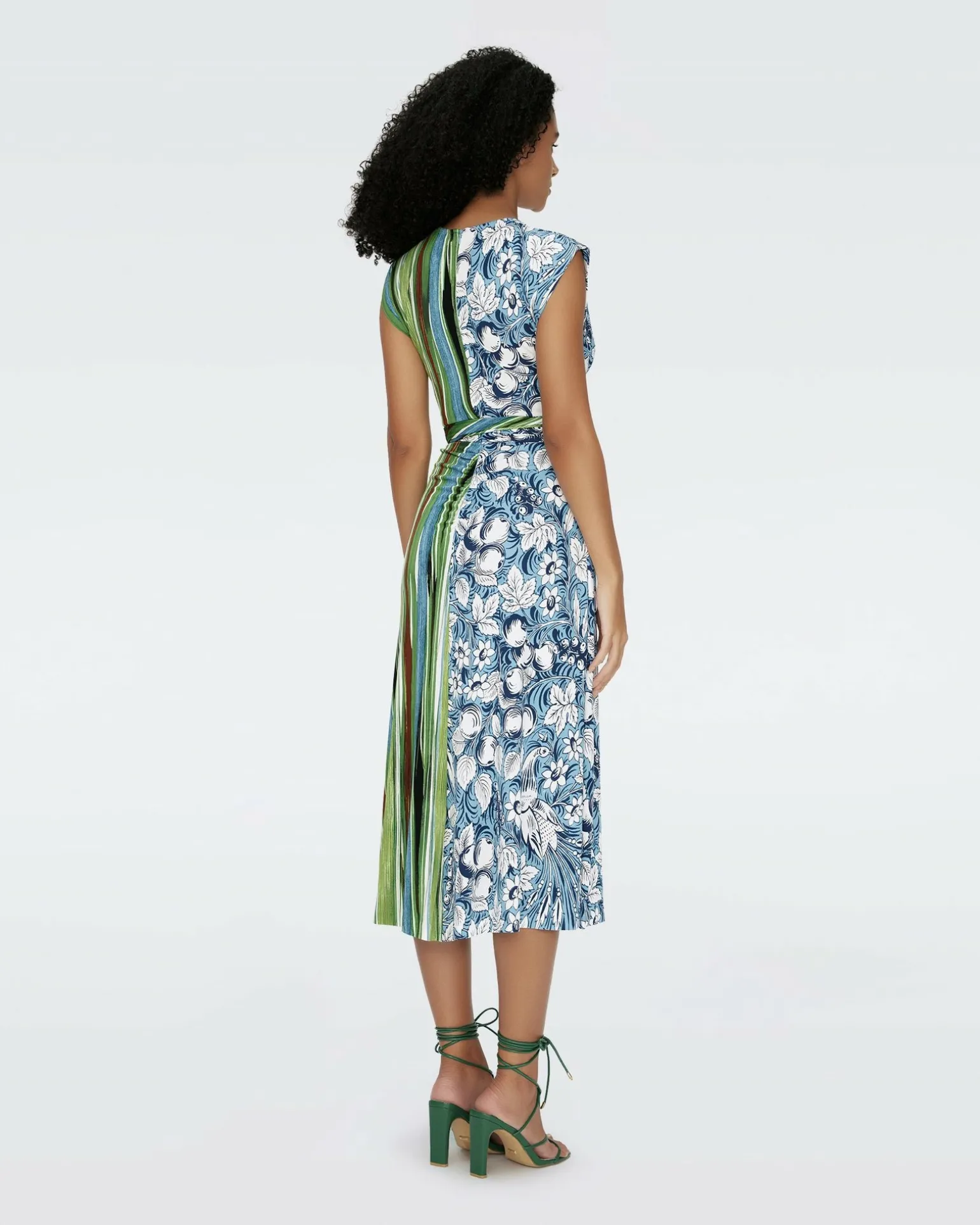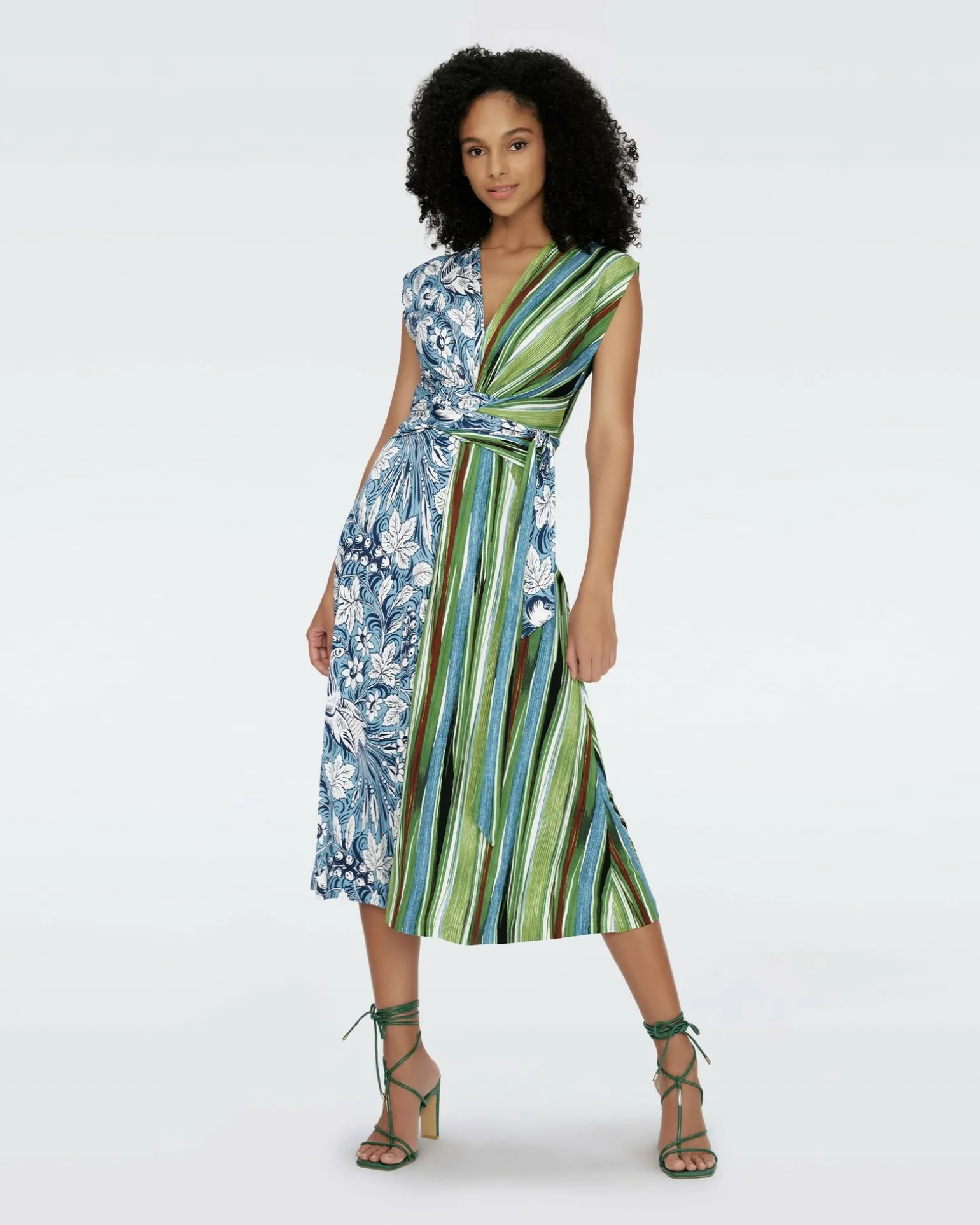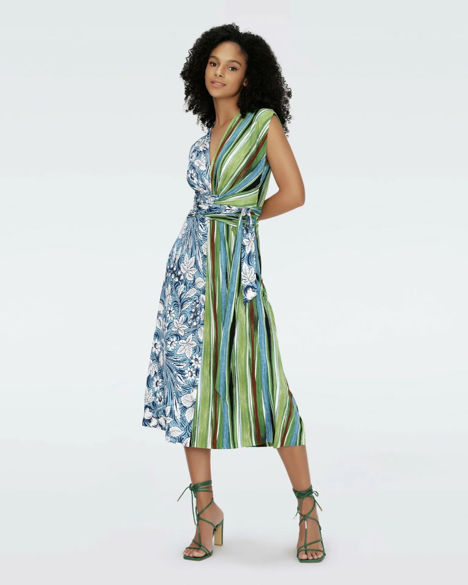 Cut From A Light Jersey, The Dorothee Midi Dress Has A Smooth, Soft Feel. This Sleeveless Piece Has A V-Neckline And A Full Skirt. Layered Gathering And A Matching Tie Cinch The Waist To Create A Flattering Fit.