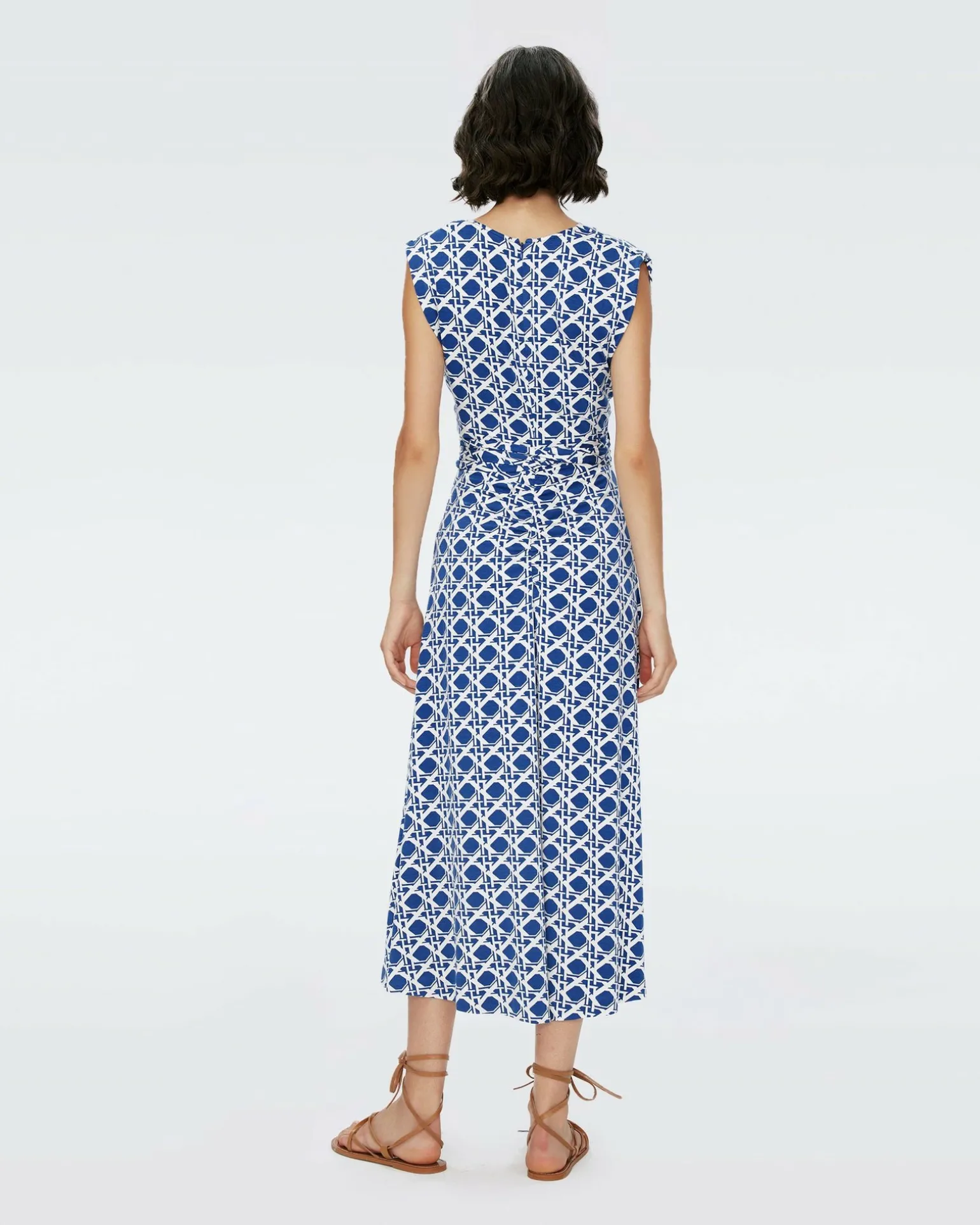 Cut From A Light Jersey, The Dorothee Midi Dress Has A Smooth, Soft Feel. This Sleeveless Piece Has A V-Neckline And A Full Skirt. Layered Gathering And A Matching Tie Cinch The Waist To Create A Flattering Fit.