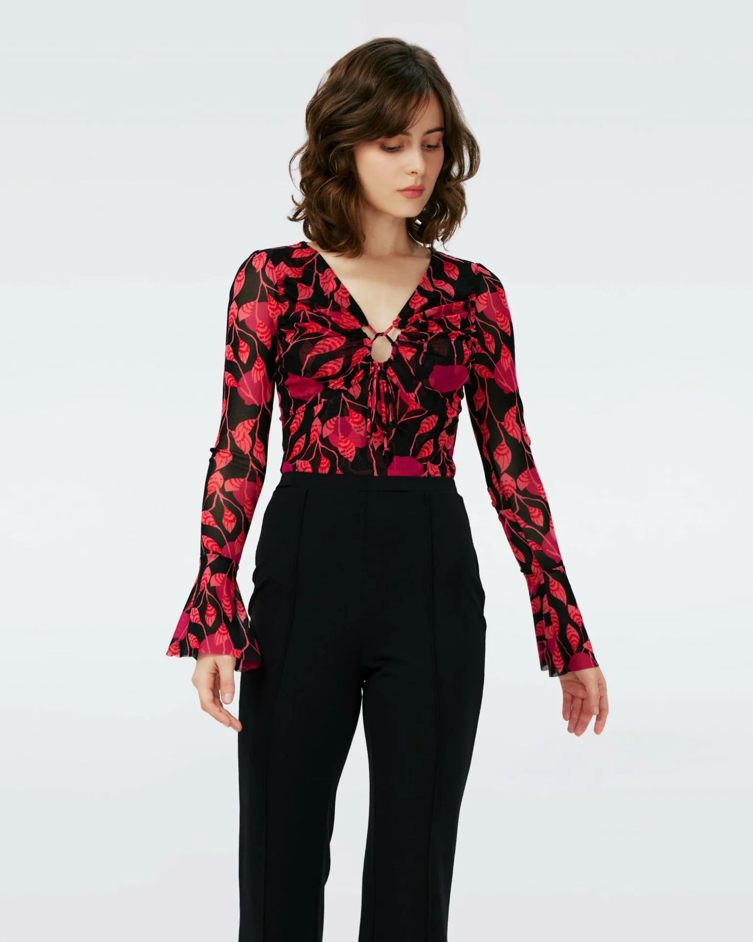 The Lyric Bodysuit Is Cut From A Stretchy, Form-Hugging Mesh. This Piece Has Long Sleeves With Bell-Like Cuffs And A V-Neckline With Tie Closure. An Updated Version Of Our Popular Lyric Top, This Bodysuit Will Stay Securely Tucked Into Whichever Bottoms You Pair With It.