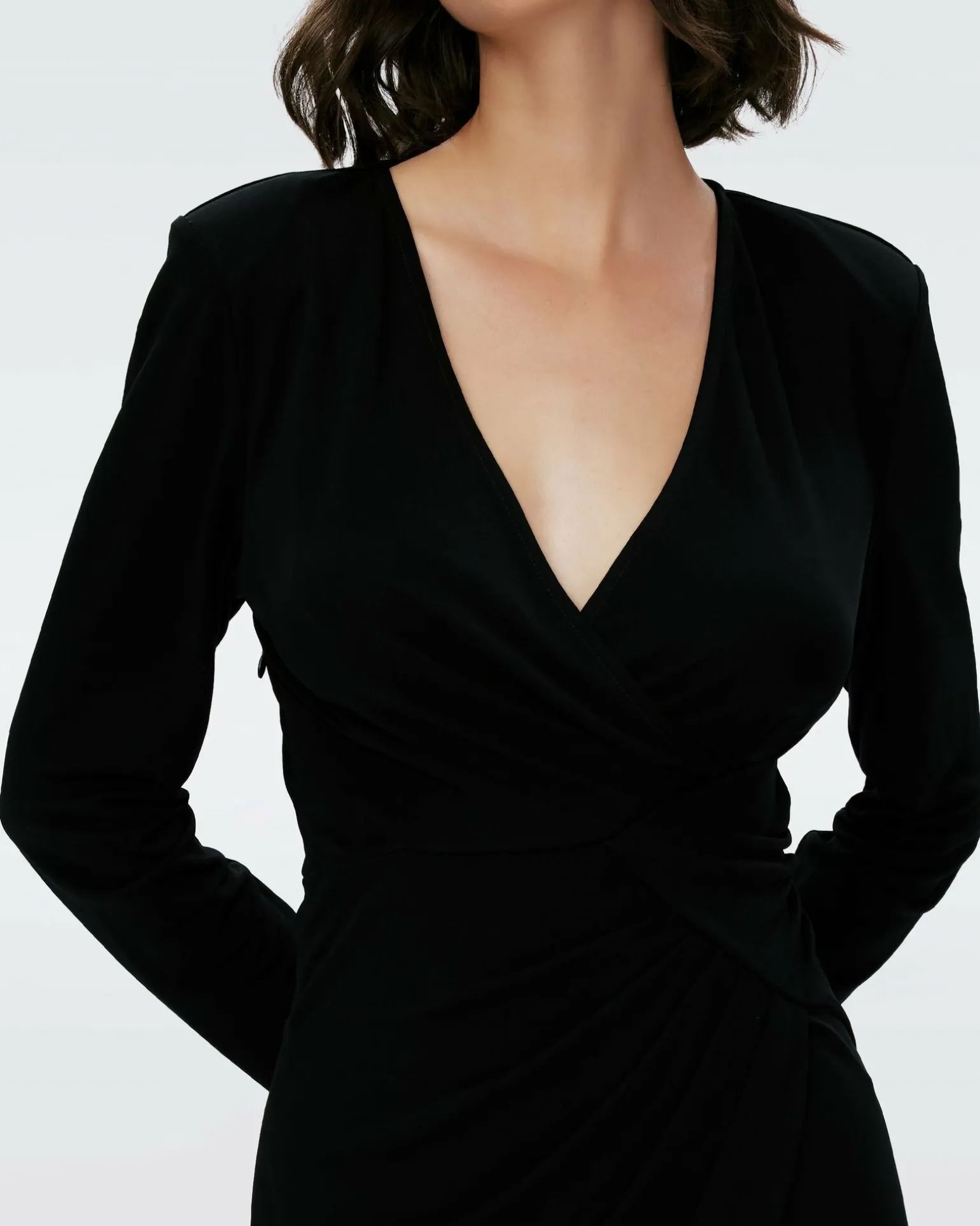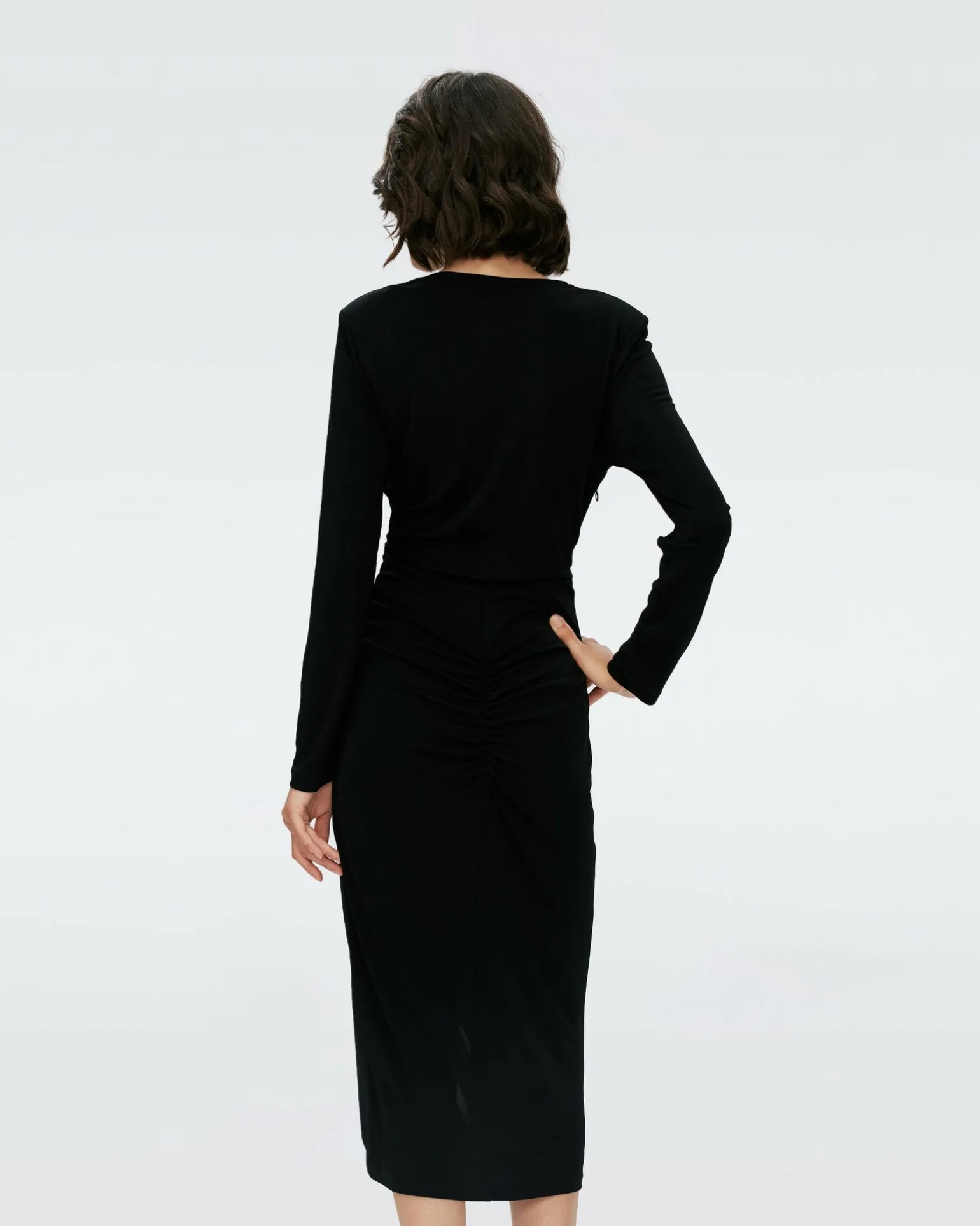 Cut From A Soft Matte Jersey, The Nevine Midi Dress Has A Smooth, Clean Finish. This Little Black Dress Has A V-Neckline, A Wrap-Style Bodice, And A Skirt With A Tulip Fold That Shows Some Leg.
