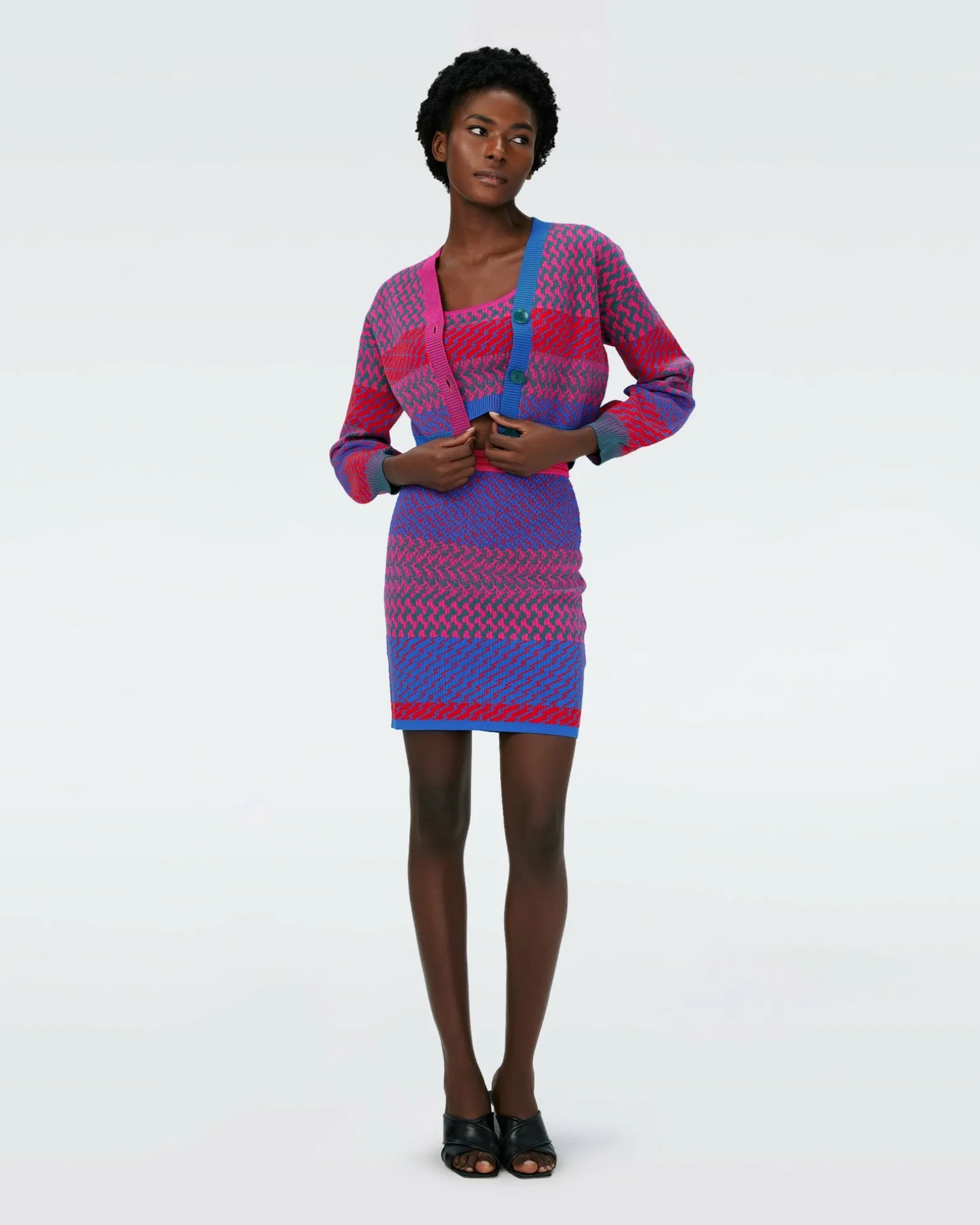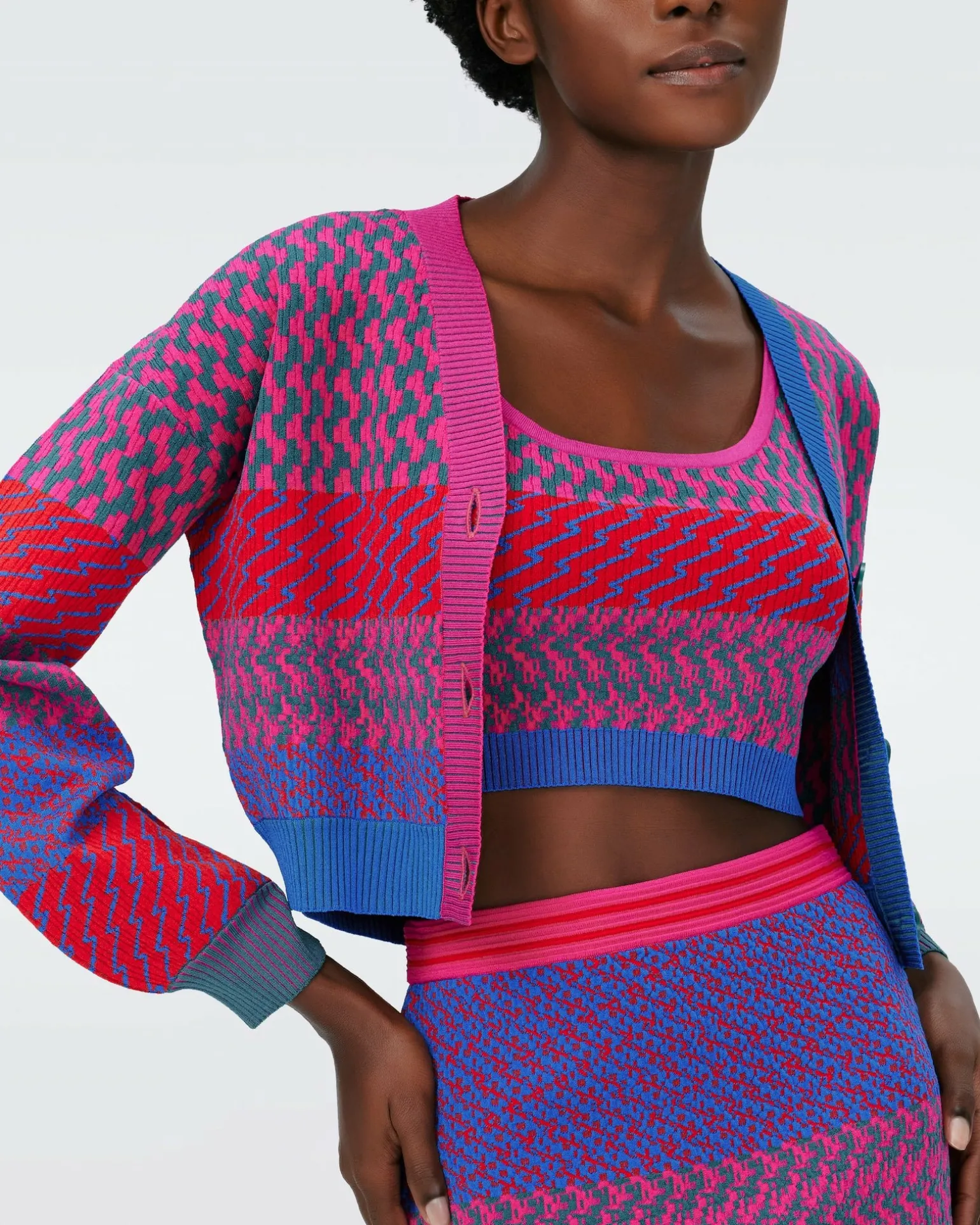 Cute And Cropped, The Rema Cardigan Is Made From A Soft Knit Jacquard. This Piece Has Long Sleeves, Contrasting Detail Throughout, And Buttons Up The Front. Pair It With The Viv Knit Skirt And Arpita Top For The Ultimate Matching Look.