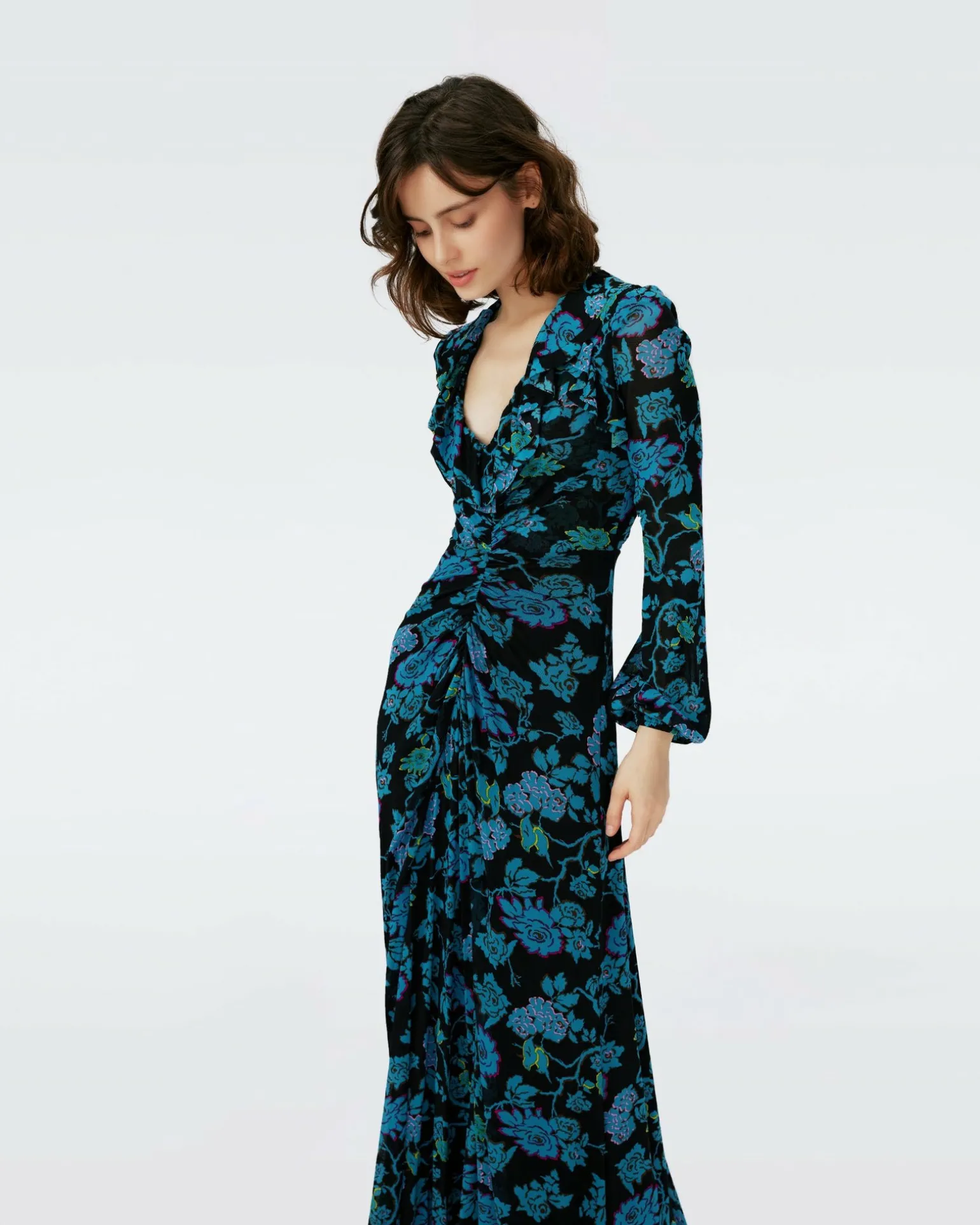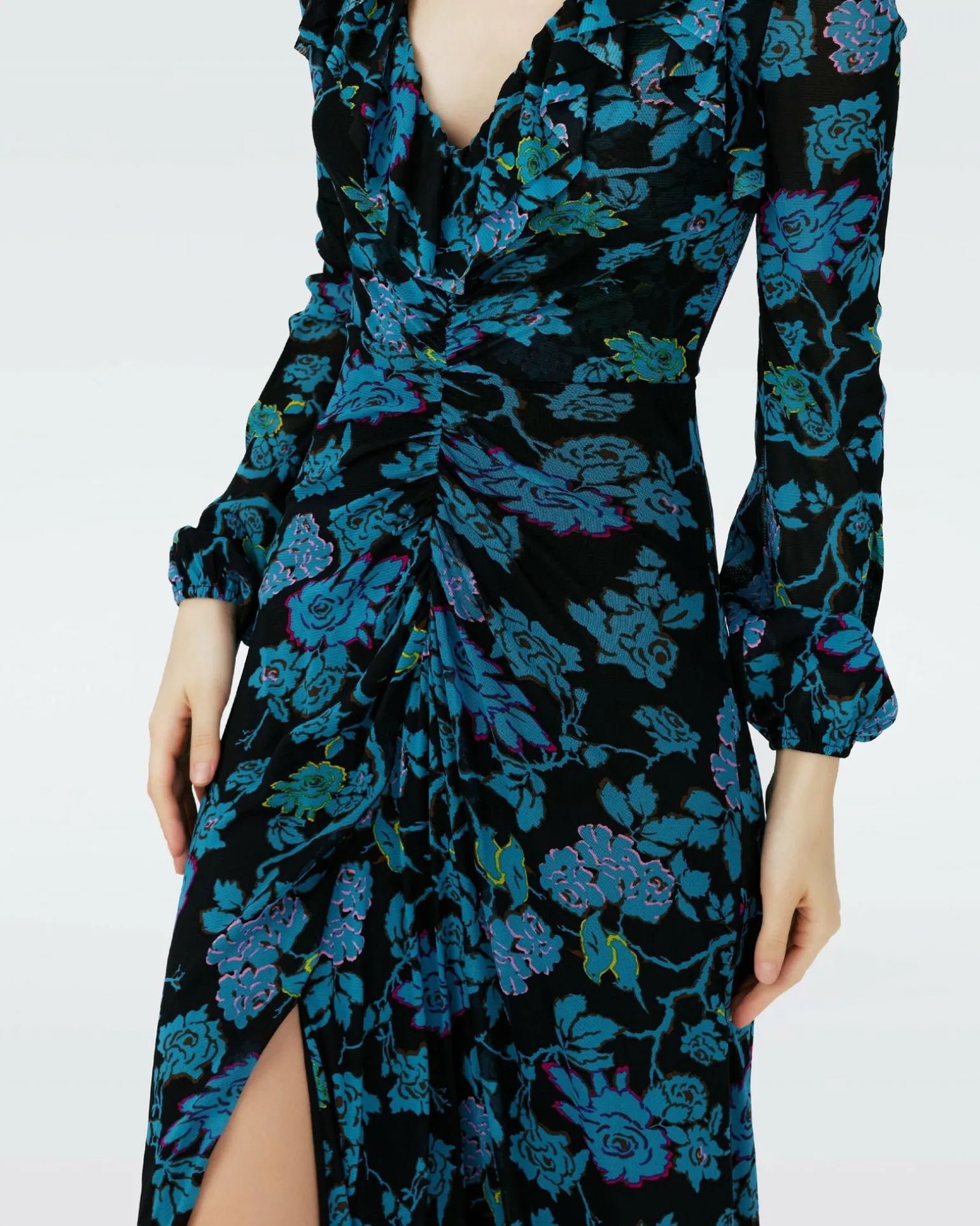 The Sean Maxi Dress Is Cut From A Soft And Stretchy Mesh. This Piece Has Long, Billowy Sleeves, A Ruched Center, And Ruffle Detail Along Its V-Neckline. With A Lettuce Hem, This Occasion Piece Has A Flowing, Statement Skirt With A Single High Slit. The Best Part? A Heart-Shaped Cut-Out At The Back, That Ties At The Neckline.