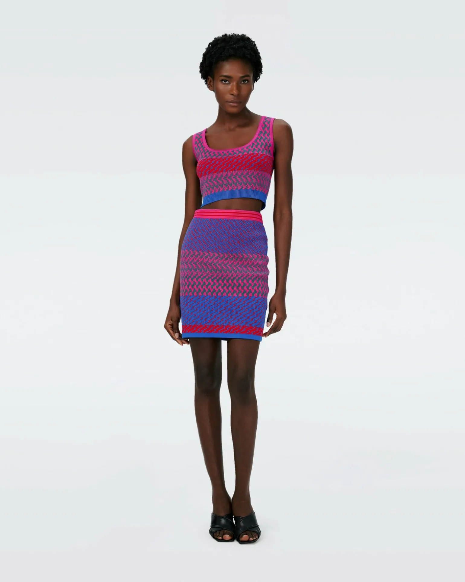 Short And Sweet, The Viv Skirt Is Made From A Soft Knit Jacquard. Cut For A High-Waisted Fit, This Piece Falls Above The Knee In A Fitted Silhouette. Pair It With The Rema Cardigan And Arpita Top For The Ultimate Matching Look.