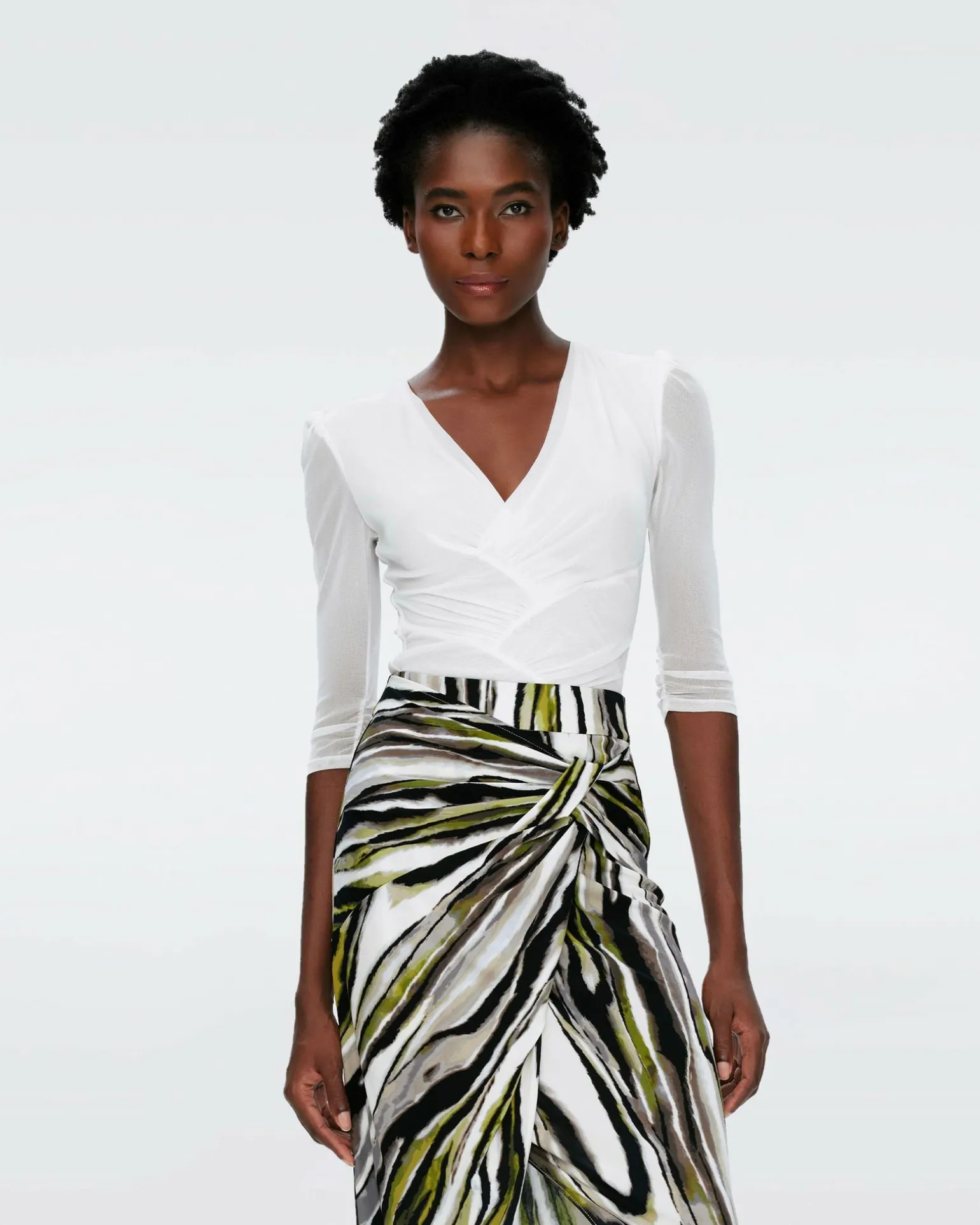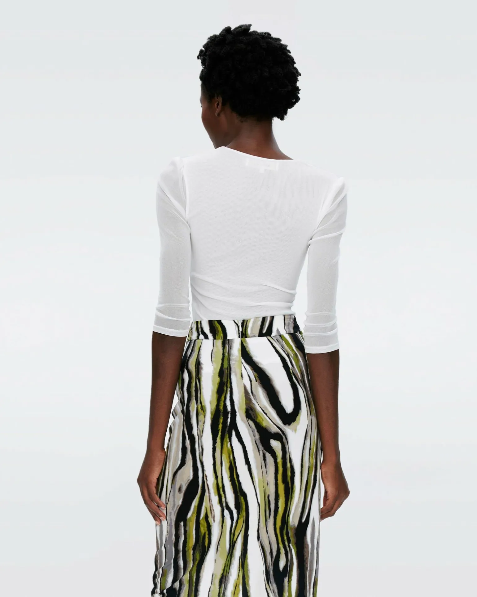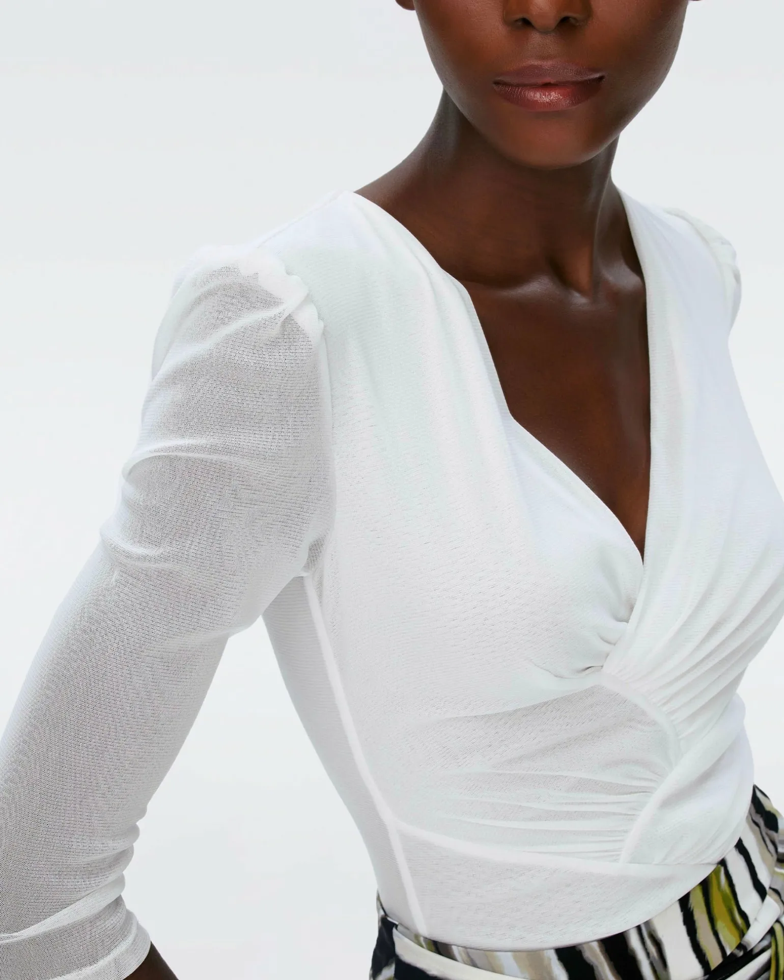 Cut From Our Beloved Mesh, The Hailey Top Has A Soft Andf Stretchy Feel. This Fitted Piece Has A A V-Neckline, Ruched Paneling Across The Bodice, And Ruched, Sheer, Three-Quarter Sleeves.