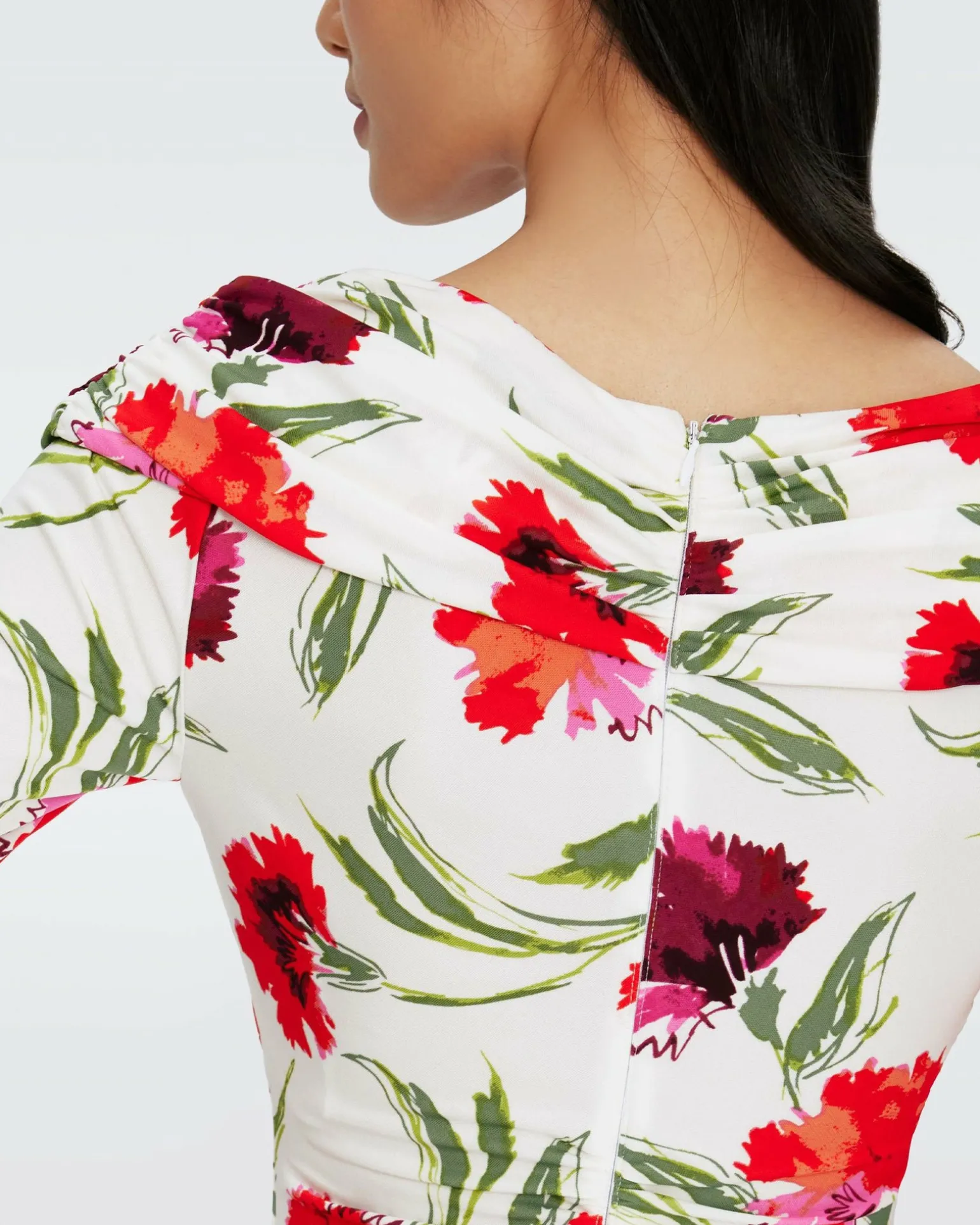 Cut From A Smooth Matte Jersey, The Jim Dress Falls Around The Knee. This Piece Has Three-Quarter Sleeves, Ruching At The Center, And A Hidden Back Zip. With Gathered, Criss-Cross Detail At The Neckline, It Can Be Worn On Or Off The Shoulders.