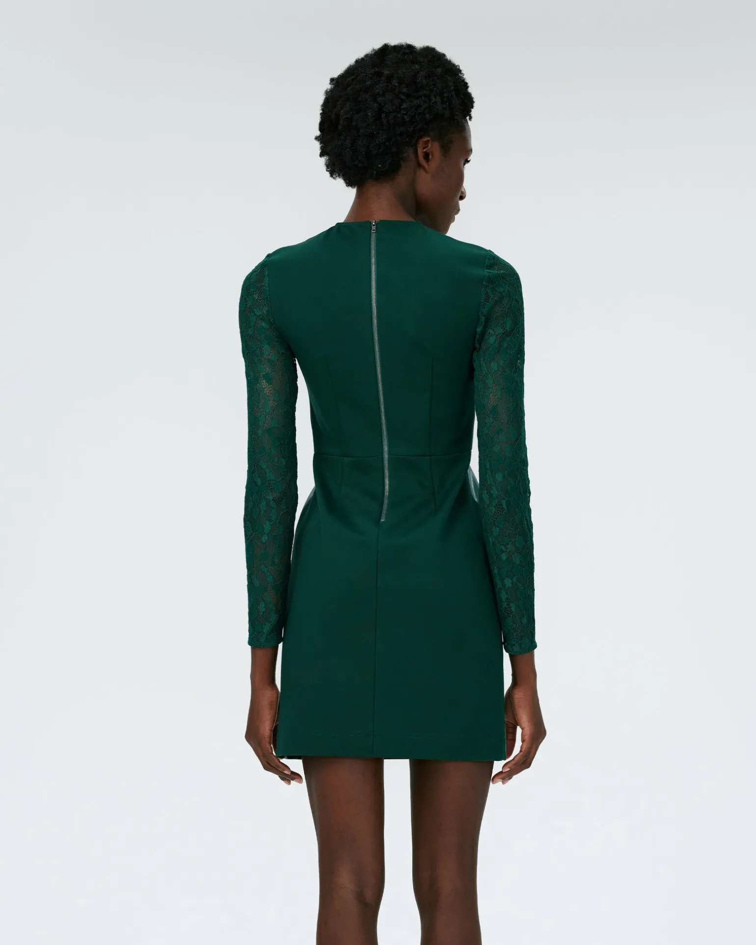 The Juanita Dress Combines Lace With Ultra-Soft Vegan Leather. This Piece Has Long Lace Sleeves, A High Neck, And A Subtly Cinched Waist, Falling Above The Knee.