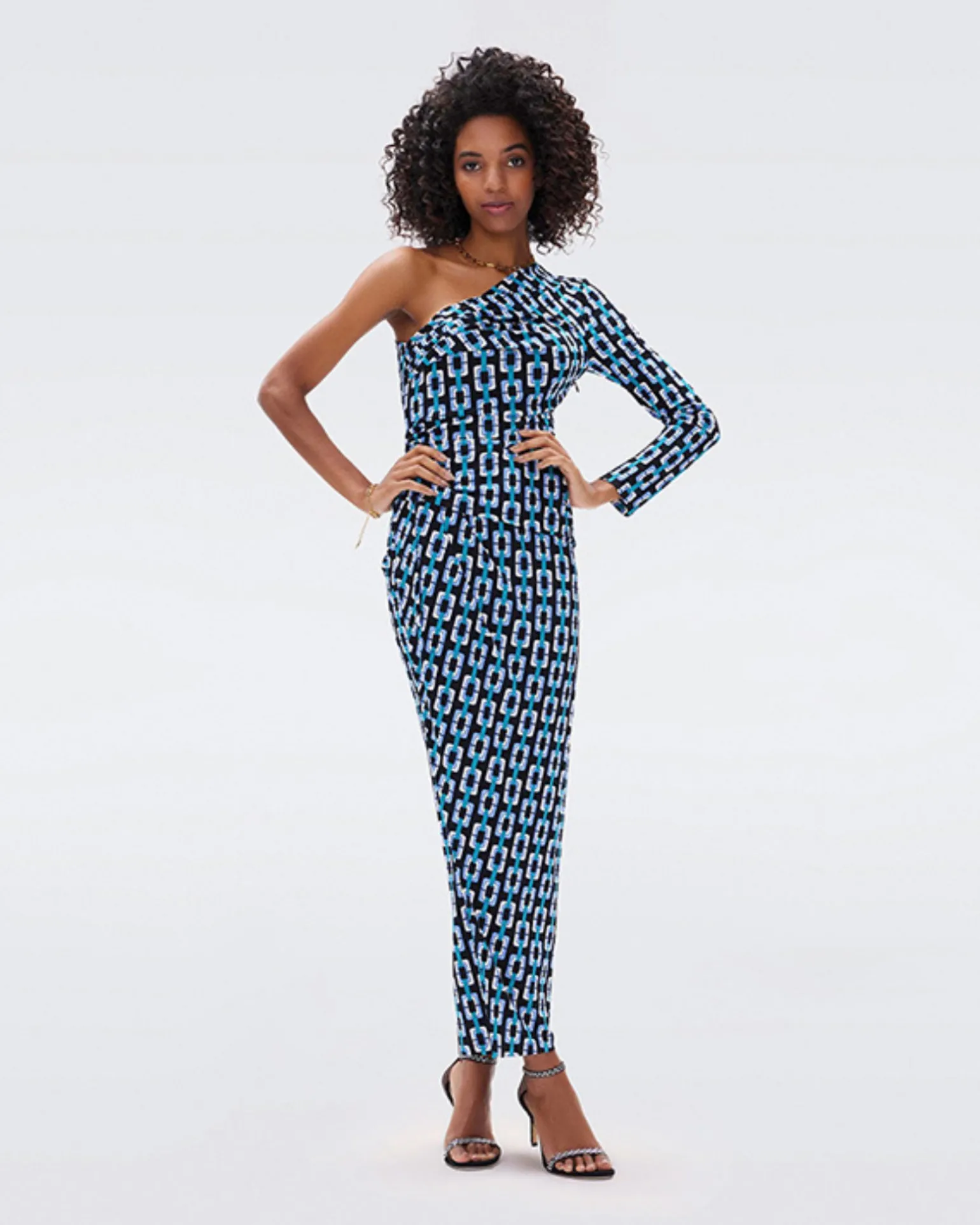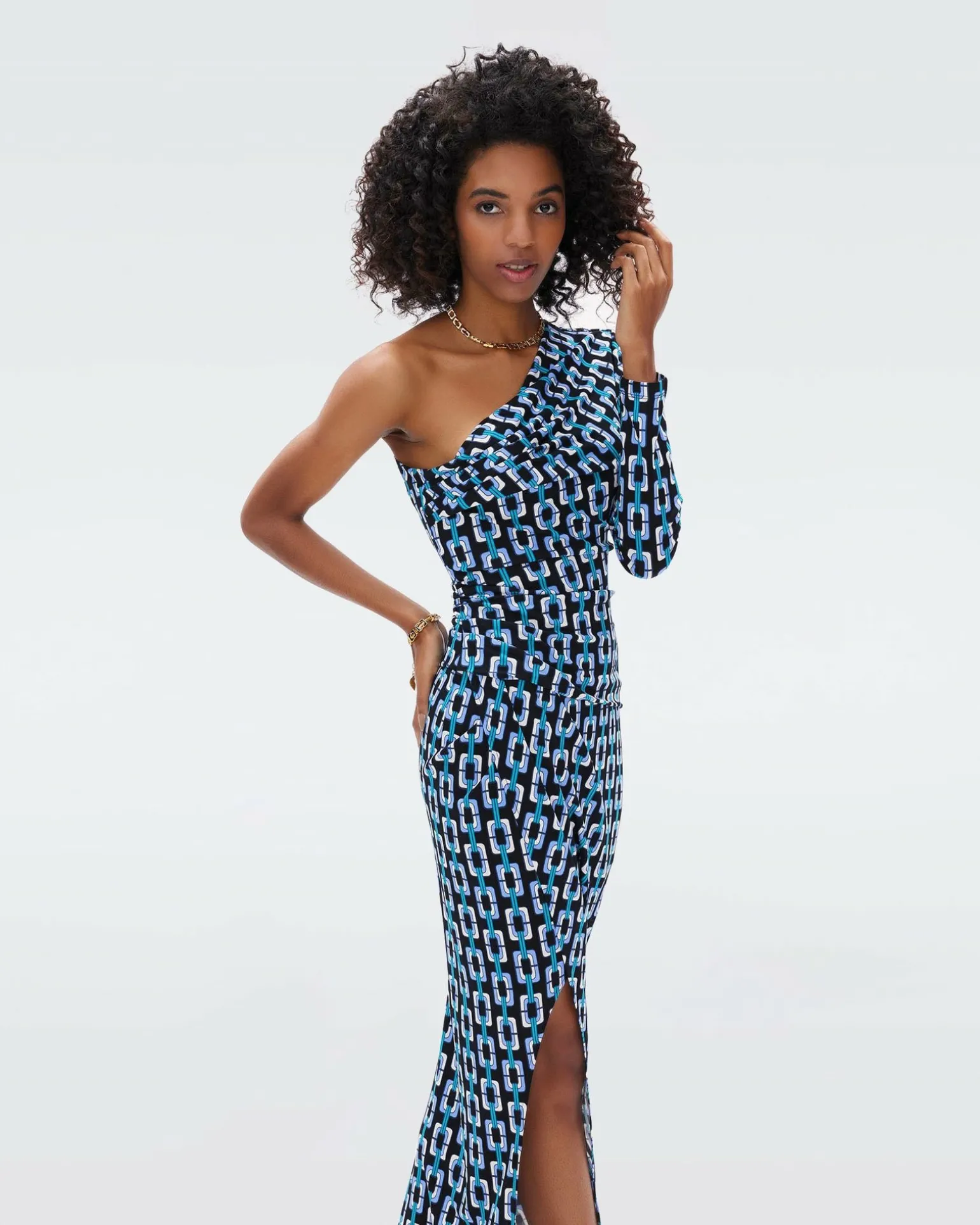 Bold And Sexy, The Kitana Dress Is An Effortless Statement Maker. This One-Shoulder Piece Has A Fitted Silhouette And Ruching At The Waist. Its Long Skirt Closes In A Tulip Fold With A Single High Slit, And Its Matte Jersey Fabric Has A Soft, Smooth Feel.
