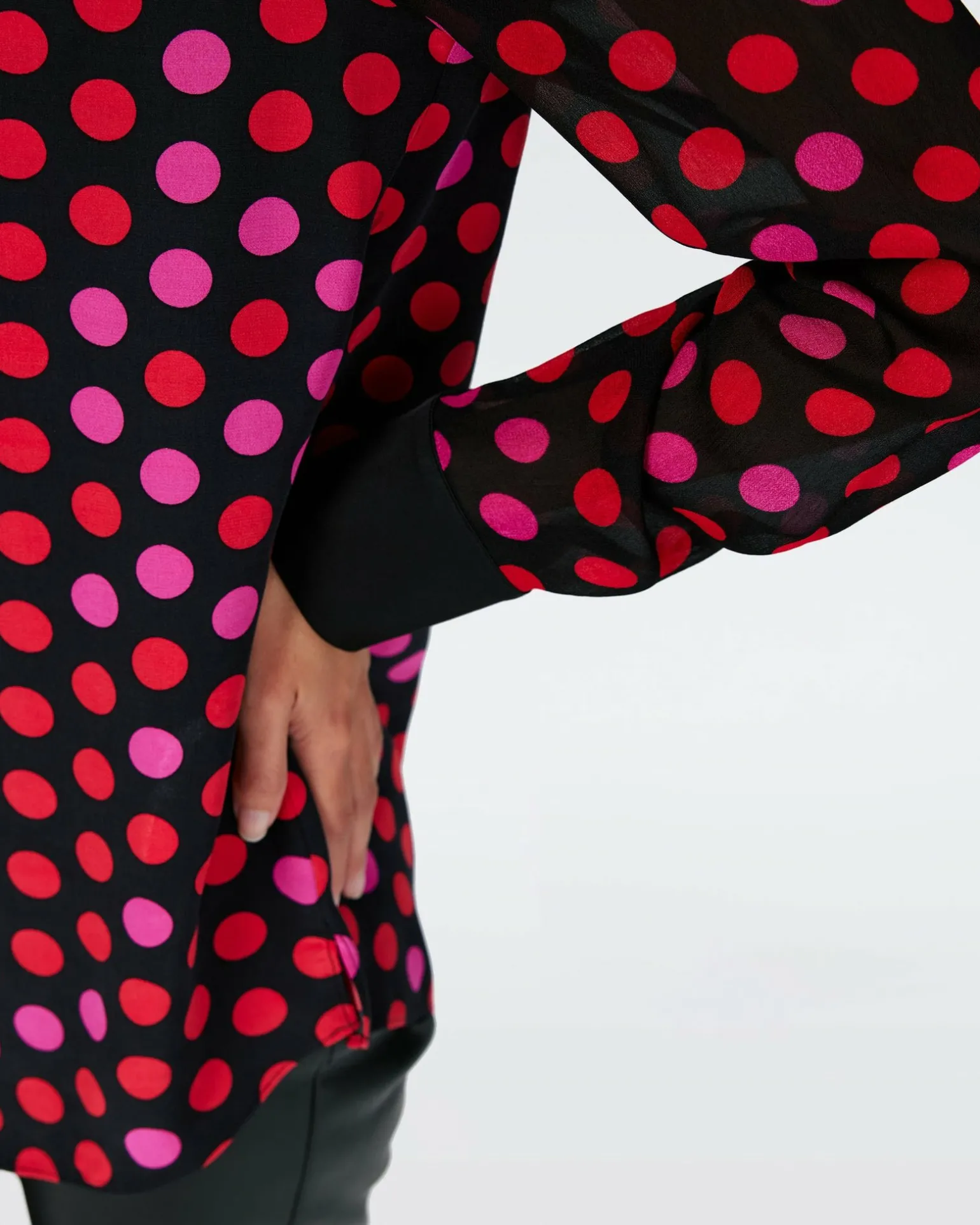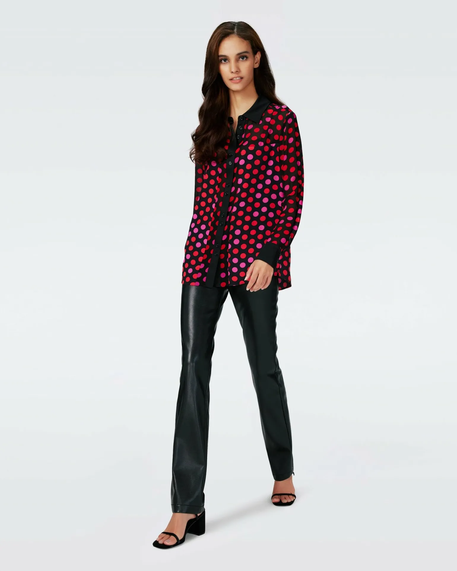 Cut From A Soft Satin With Sheer Chiffon Sleeves, The Louise Top Has A Light Feel. A Classic Shirt Silhouette, This Piece Buttons Up The Front With A Collar And Cuffs In A Contrasting Solid Black.