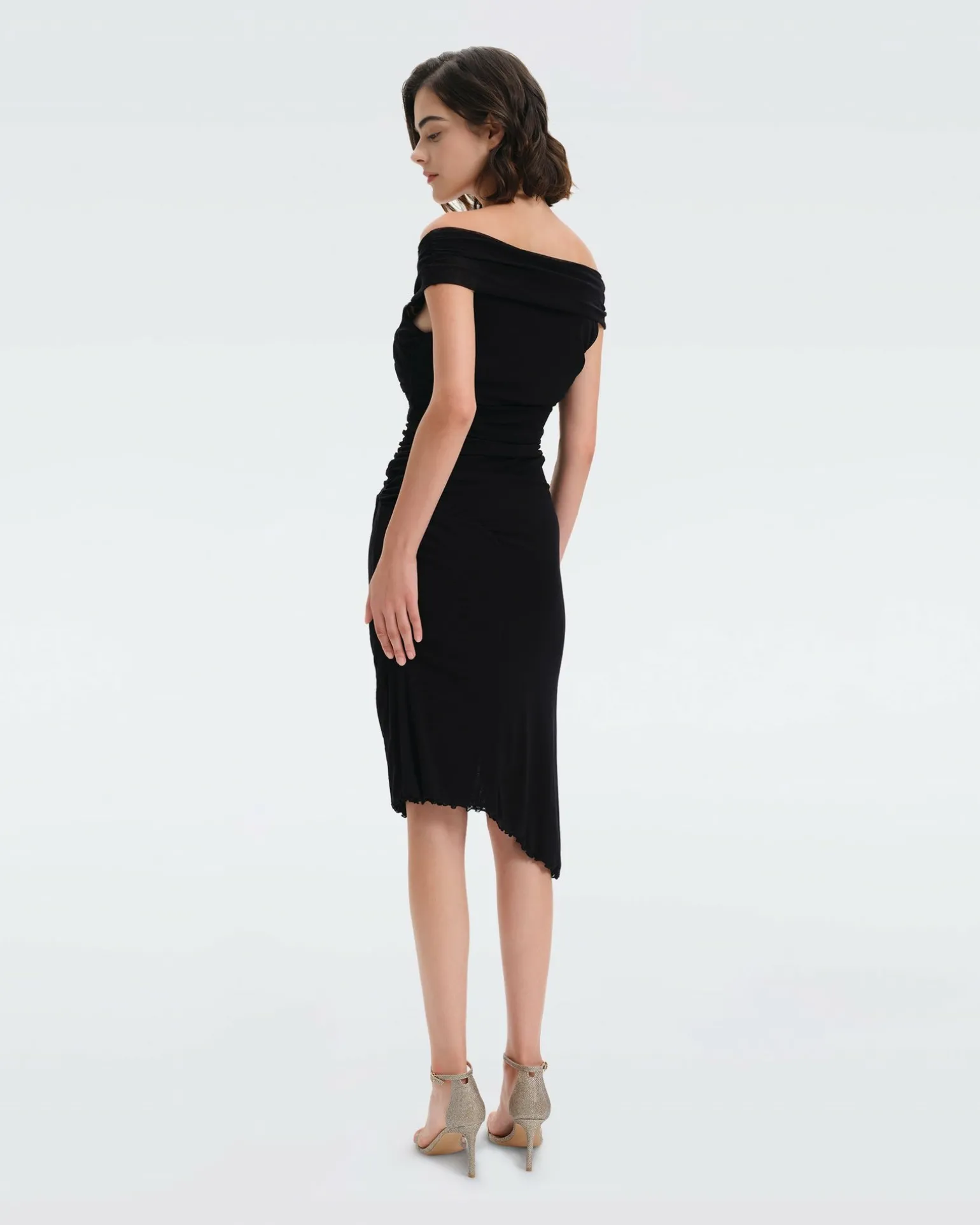 The Lovinia Is A Fitted Midi Dress Cut From A Soft, Stretchy Mesh. This Off-The-Shoulder Dress Is Flatteringly Ruched And Has A Small Slit To The Mid-Thigh And A Lettuce Hem.