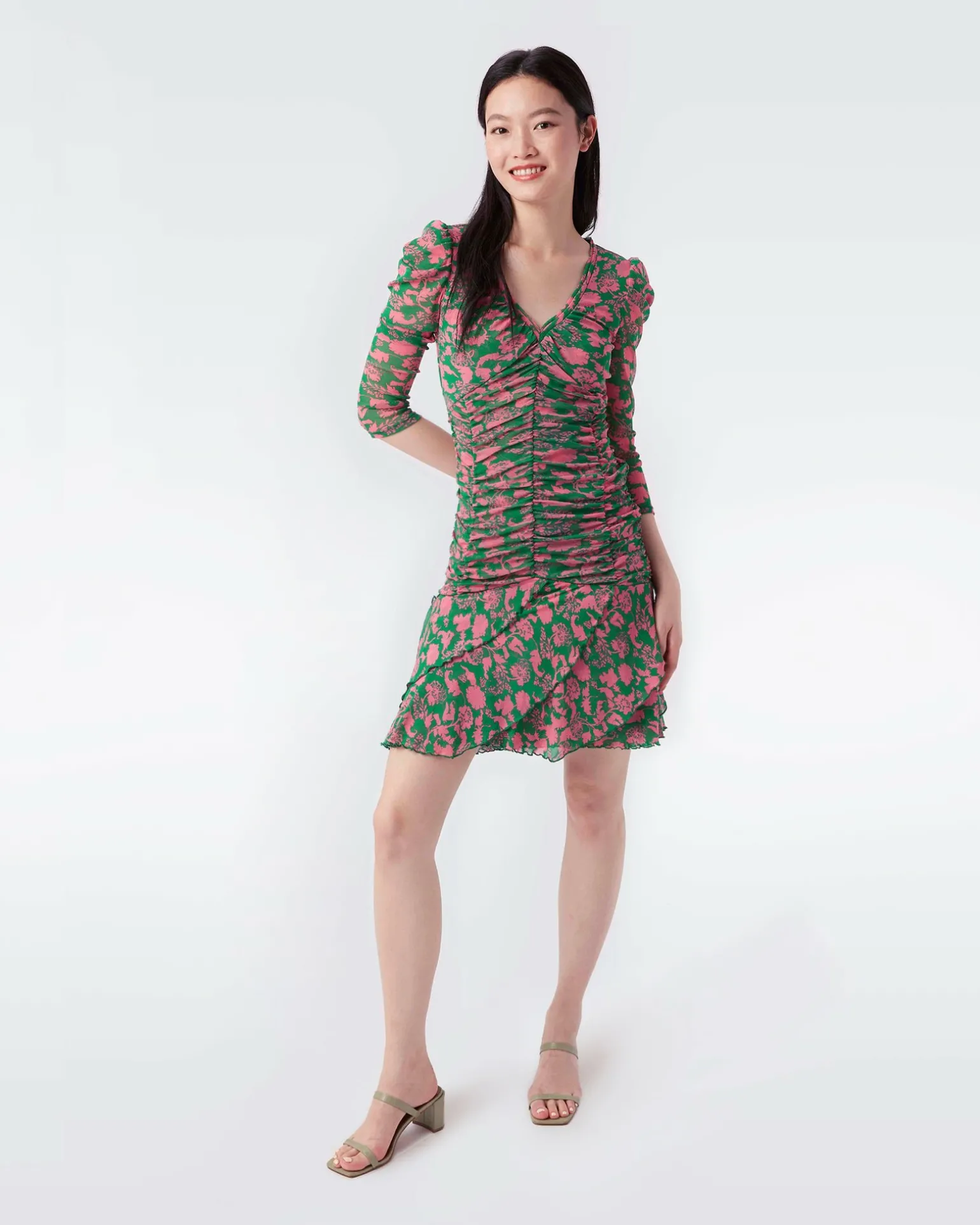 The Marcelle Dress Is Tailored With Sexy Fishbone Pleats And A Diagonally Tiered Skirt With Lettuce Hems. It Has Three-Quarter Sleeves, A V-Neckline, And Is Cut From A Body-Hugging Mesh.