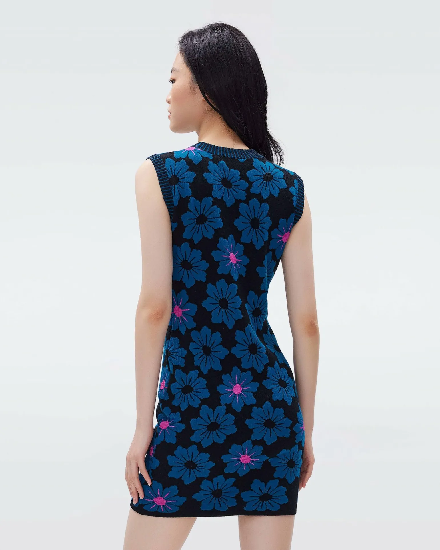 Made From A Wool Blend Jacquard, The Mylo Mini Dress Allows You To Stay Warm While Showing Some Skin. This Sleeveless Piece Has A High Neck With Contrasting Detail And A Close Fit. As The Weather Cools, Add The Matching Petey Cardigan To Complete The Look.