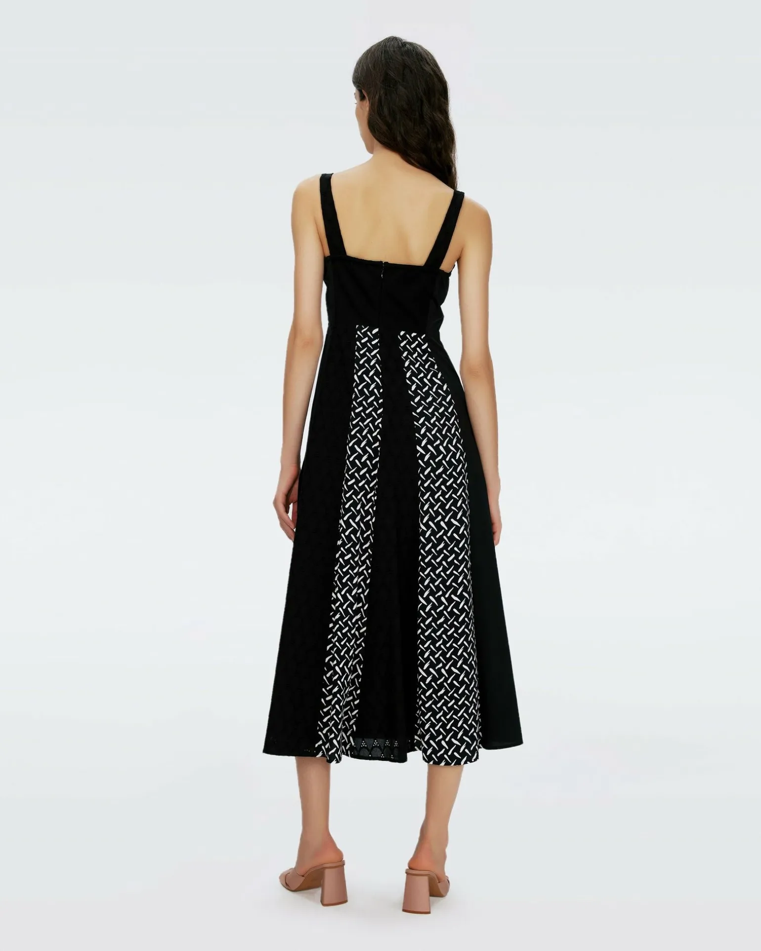 Made From A Soft Cotton, The Otto Dress Has An Elegant Look And A Comfortable Feel. This Piece Features Thick Spaghetti Straps, Back Smocking, A Cinched Waist, And A Full Skirt. Contrasting Panels That Run Down The Front Give This Solid Piece Structure And Variation.