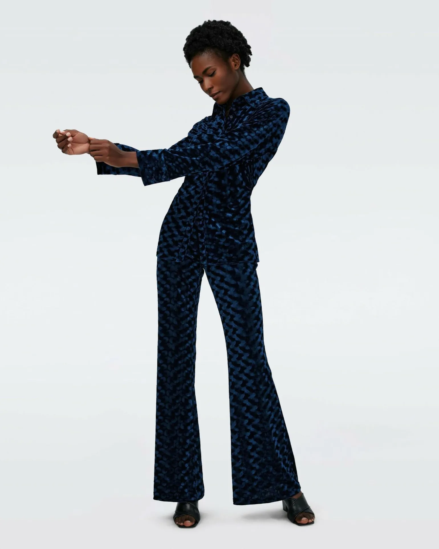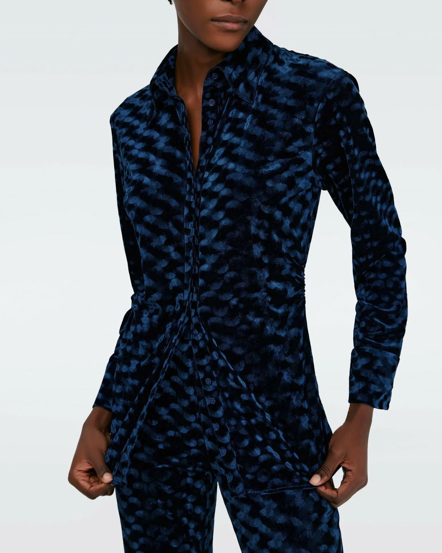 Effortless And Elegant, The Soluck Top Is Cut From A Soft And Luxurious Velvet. This Piece Has A Classic Collar, Long Sleeves With Cuffs, And Buttons Down The Front. Pair It With The Matching Ruthette Pants To Complete The Look.