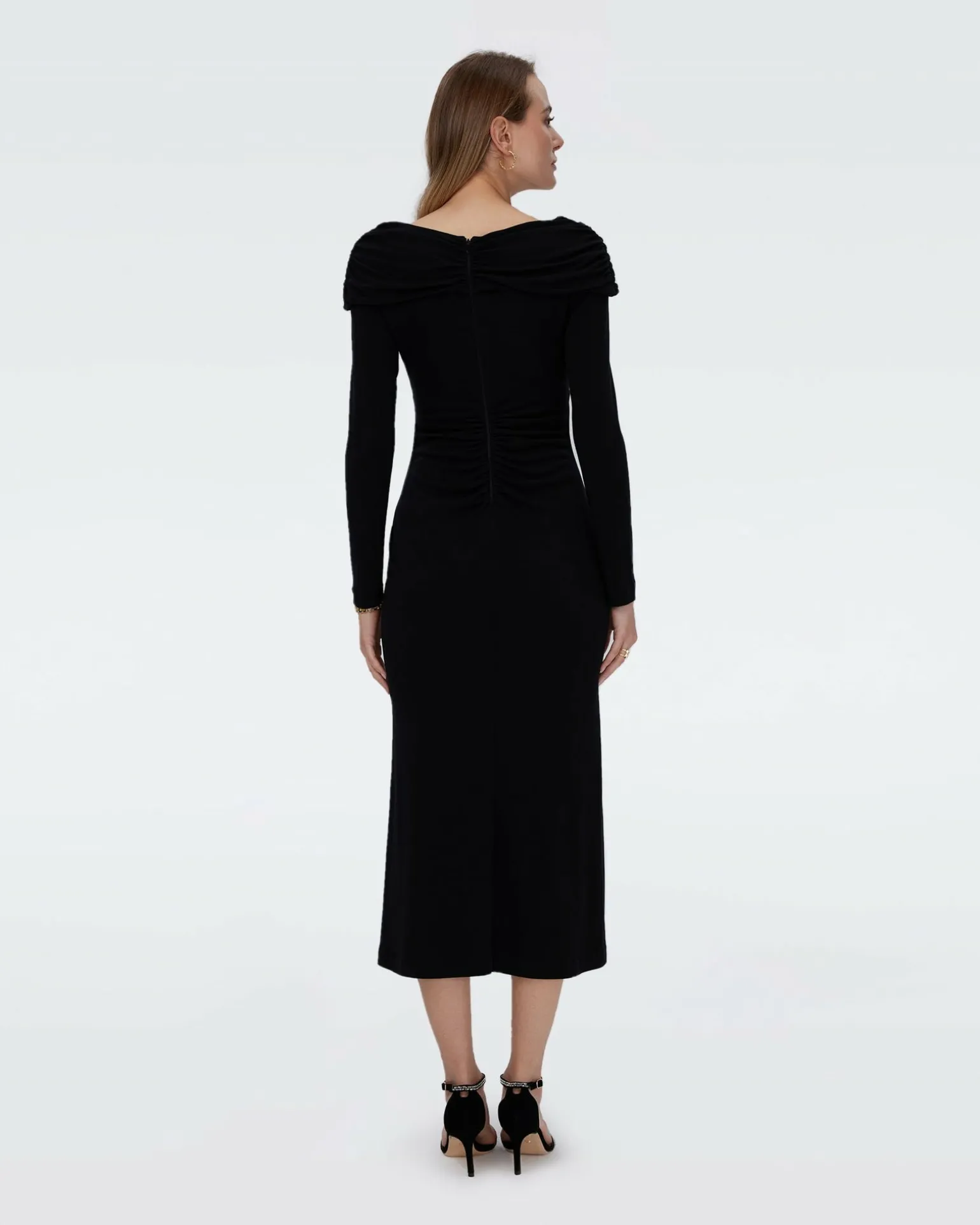 Fitted And Feminine, The Sylviana Midi Dress Is Crafted From A Comfortable Wool. This Piece Has Long Sleeves, A Flattering Neckline And A Fitted, Ruched Bodice That Ends In A High-Low Hem.